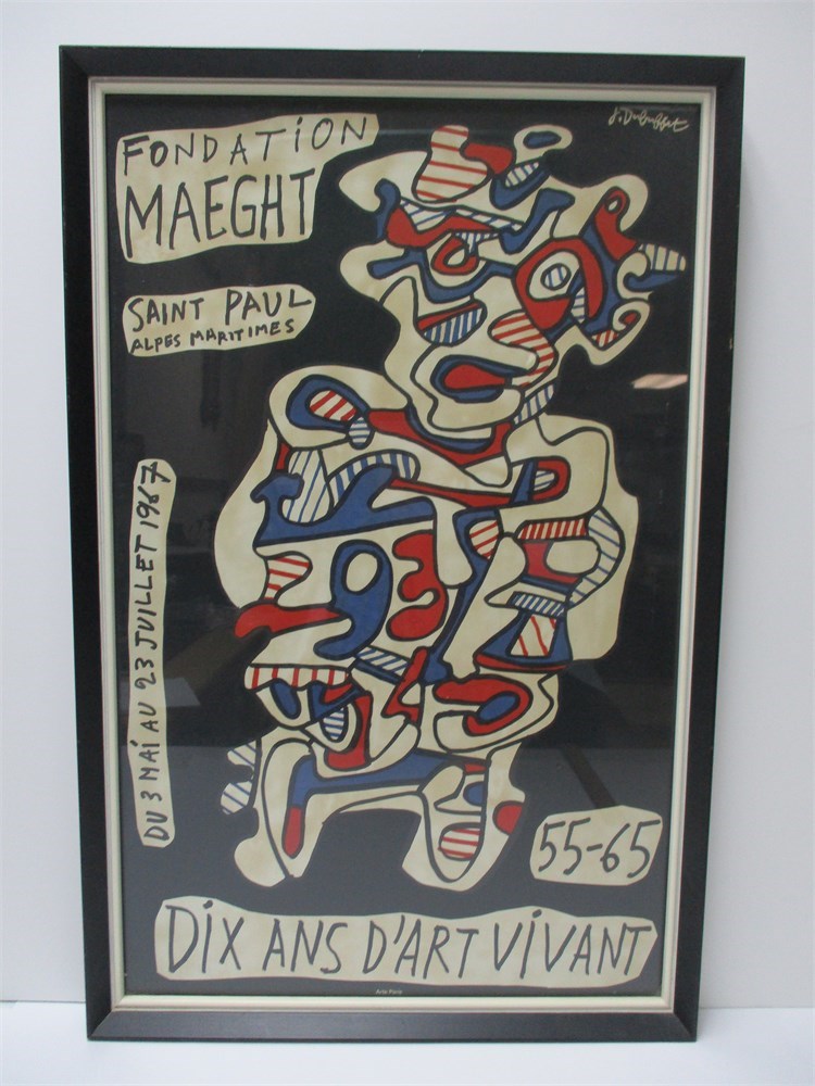 This is a fabulous framed Original Poster Paper, Published by Fondation Maeght", Saint-Paul Alpes Maritime, from May 30 July 23, 1967, "Ten Years of Living Art".  Designed  by Jean Dubuffet, French artist 1901-1985.  Wonderful colors, graphics, and condition !   Measures 16x25 and ready for hanging.