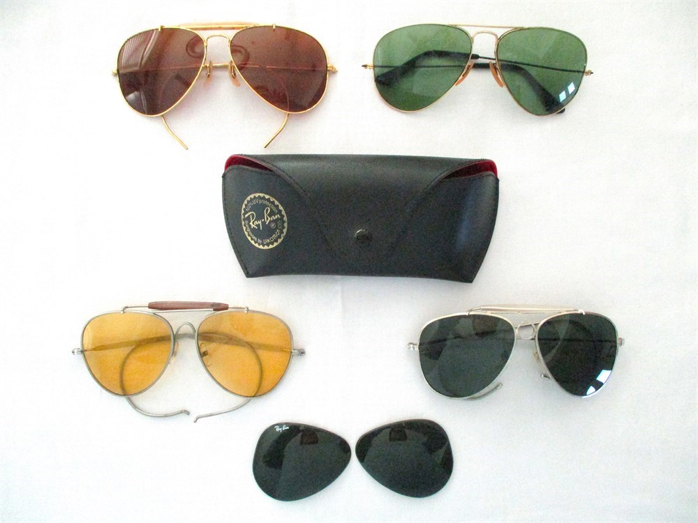 This vintage lot of Aviators is a one-owner lot, acquired from 1970's-1980.  Top left; 1980 Polycarb Aviator Loop Frame Glasses Amber Lenses, Top right; 1980 Aviator Green Lenses.  Middle row: Ray Ban  Ray Ban Empty Case, Black leather case.  Lower row; 1980's Aviator Bullit, Loop frame Sunglasses, Stainless, Green Lenses; 1970's Shooters Loop Frame Stainless, Yellow Lenses;  Bottom row, Ray Ban replacement Lenses 58mm?.  All pieces in very good condition, well cared for.