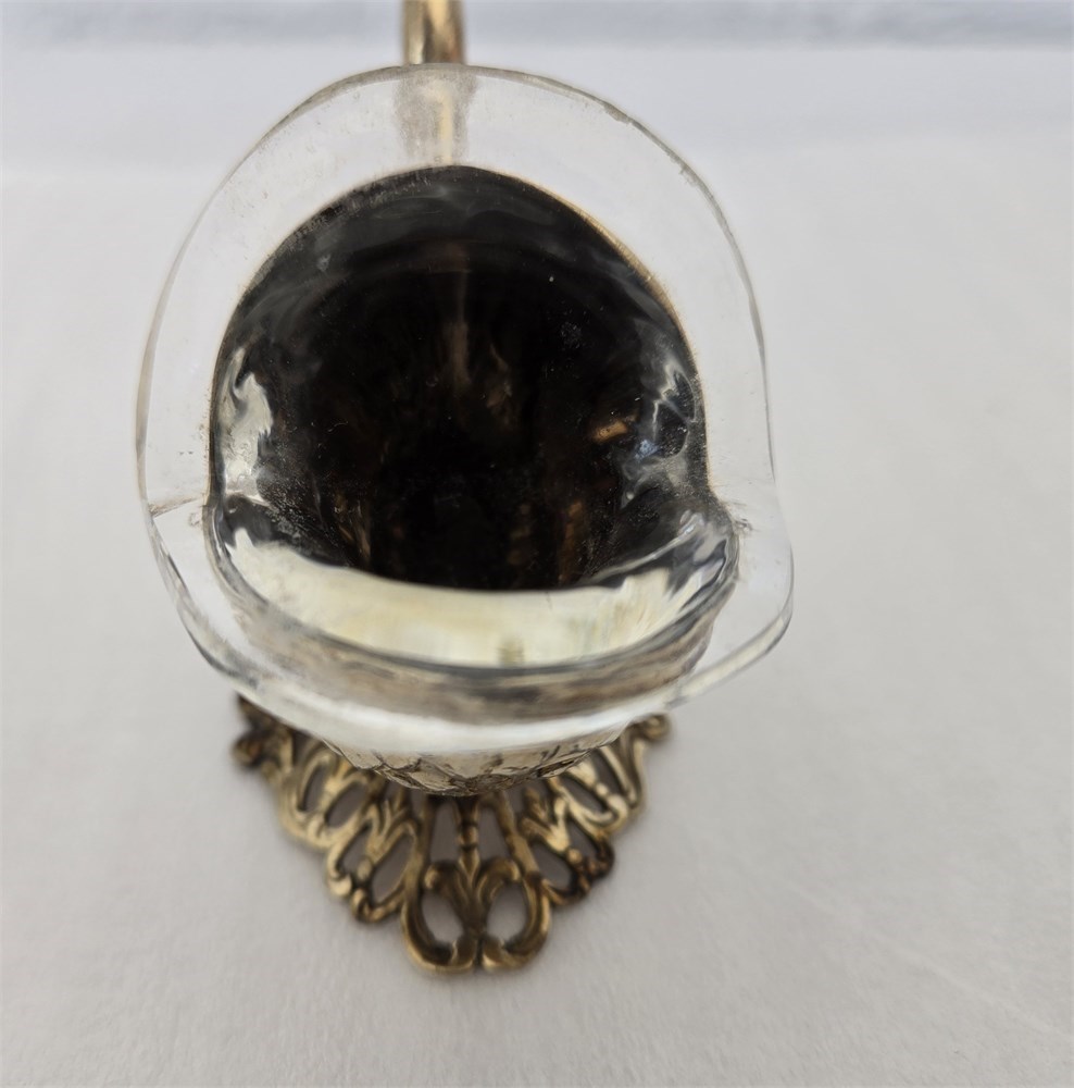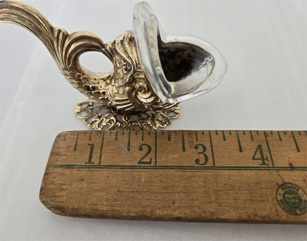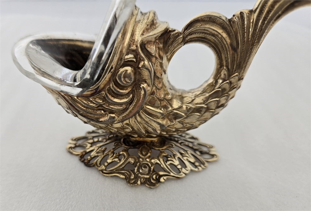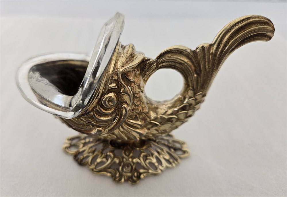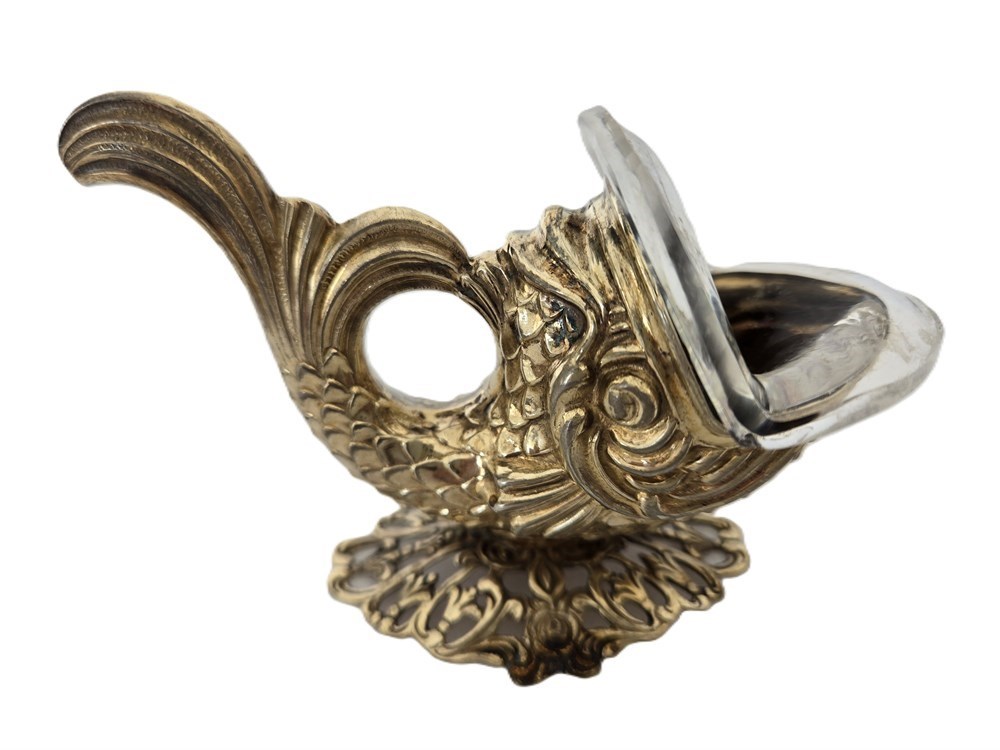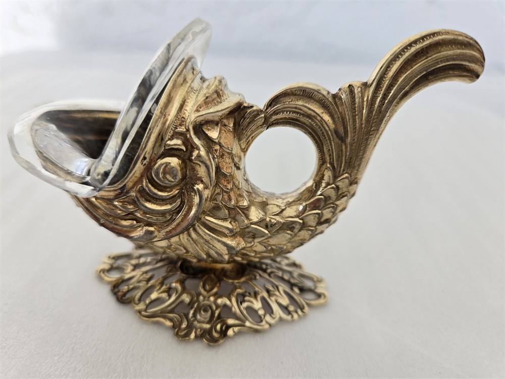 A charming late 19th-century figural table salt formed as a stylized fish or dolphin with scaled body and sweeping tail handle, the open mouth modeled as a cornucopia bowl. The vessel retains its original removable clear pressed glass liner and is raised on an ornate pierced rococo scroll base.