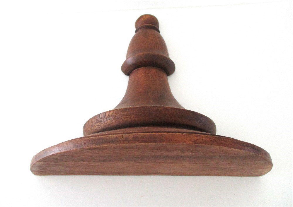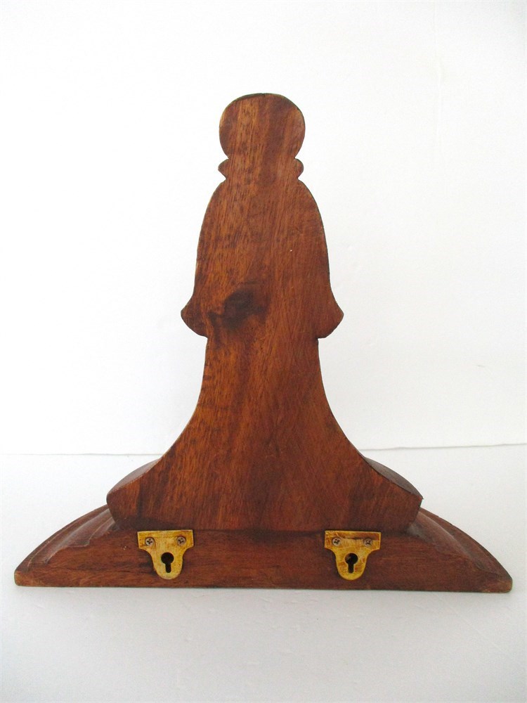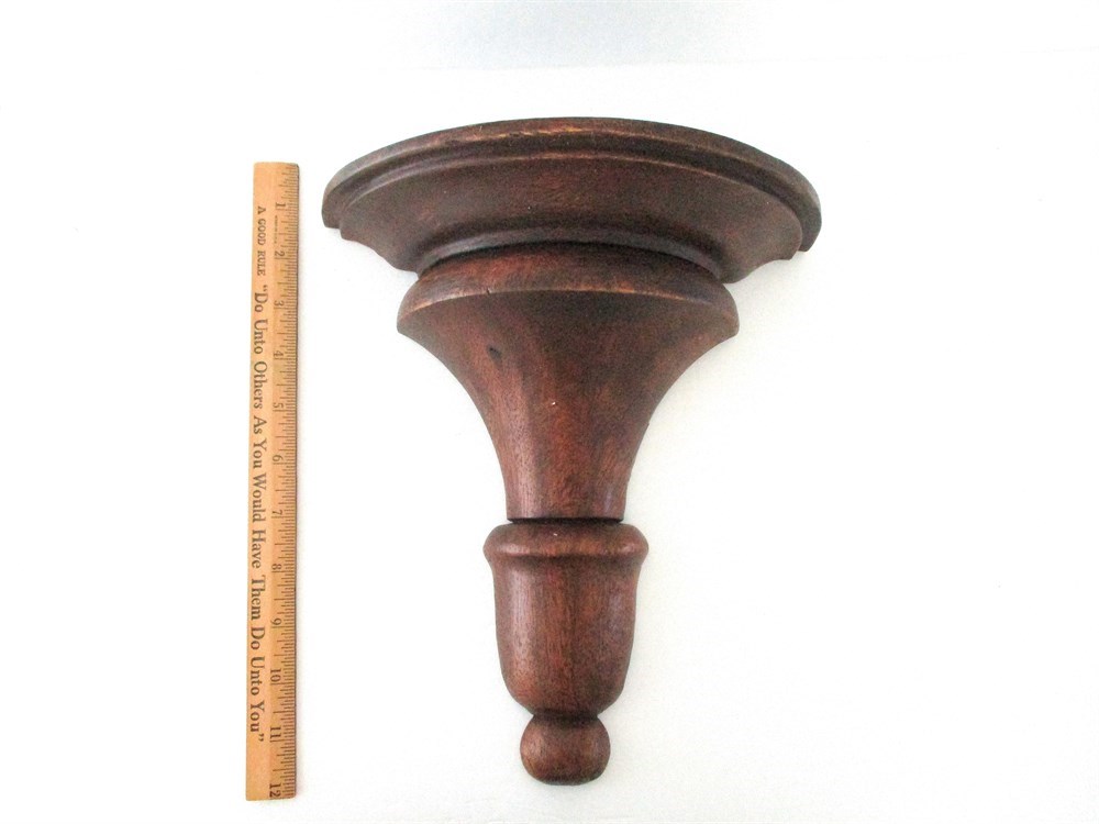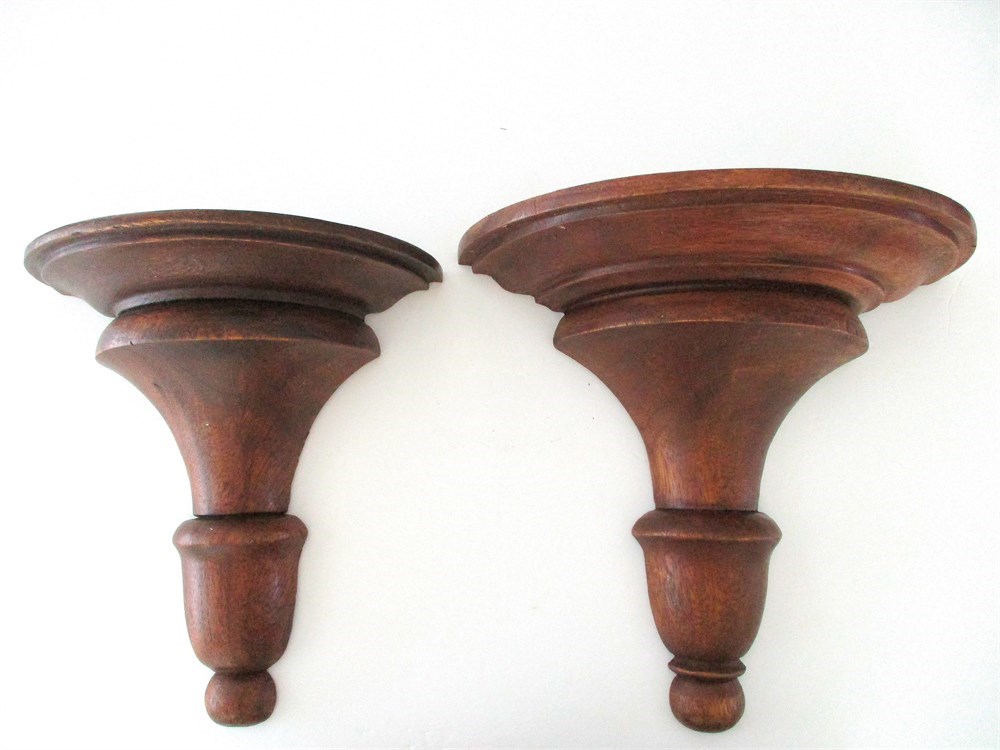 This is a wonderful pair of Vintage, Solid, Turned Wood Corbels or Brackets.  They are lathed-turned with classical profiles - flared top, baluster-style shaft and rounded finial bottom, designed to be wall-mounted to support, busts, vases, clocks, staturary, religious articles. One is slightly larger than the other which makes it easier to display in different areas.  They both display a wonderful rich patina with original mounting hardware.  One measures 11.5" tall x 12" wide with a shelf extension of 5.75" from the wall. The smaller measures 10.5" tall x 9.75" wide with a shelf extension of 4.75" from the wall.  Both are in wonderful condition with very little age related wear.