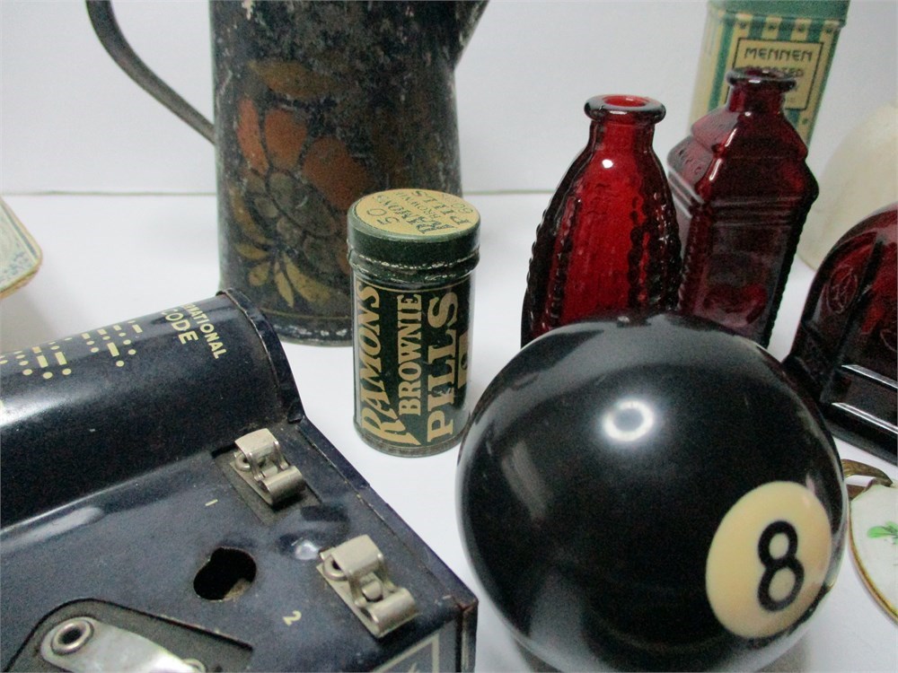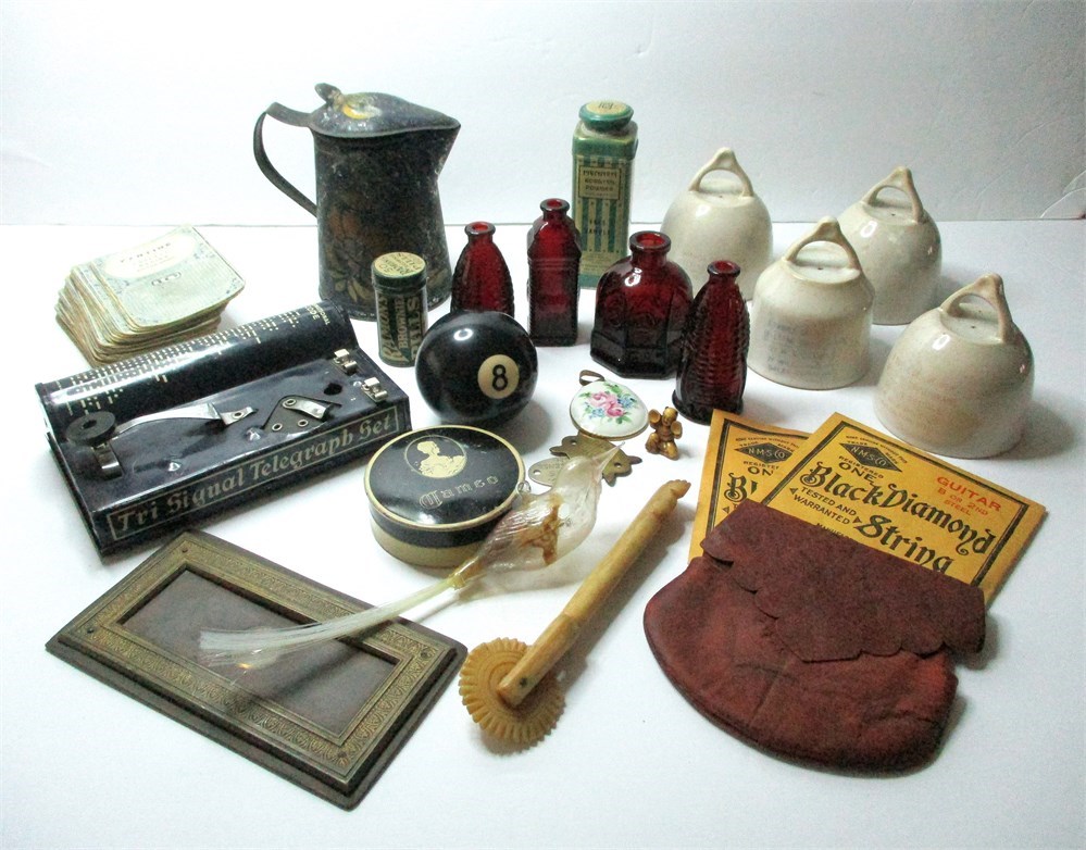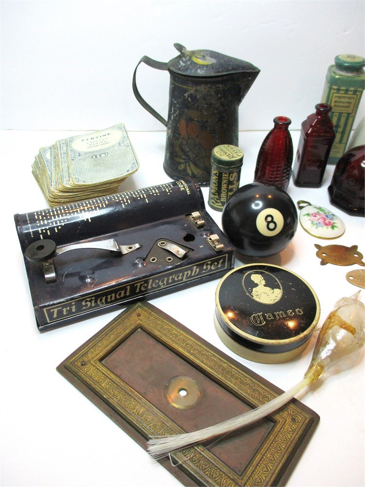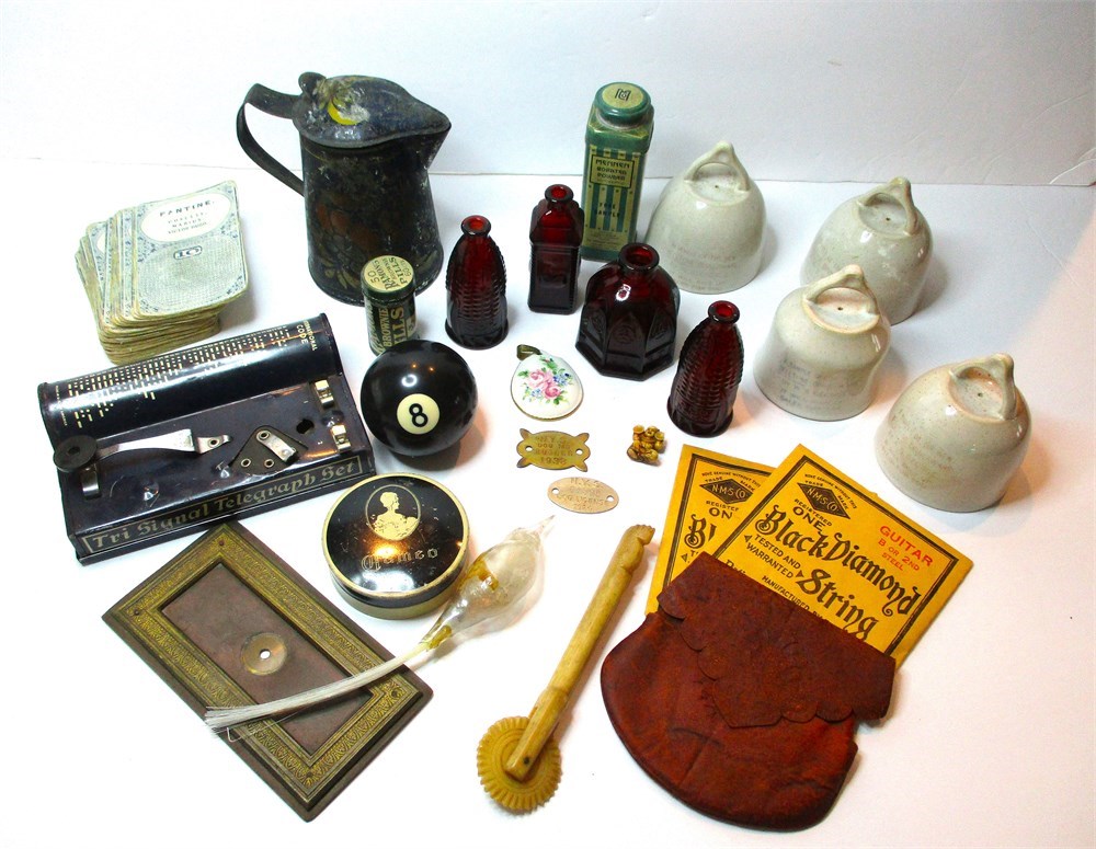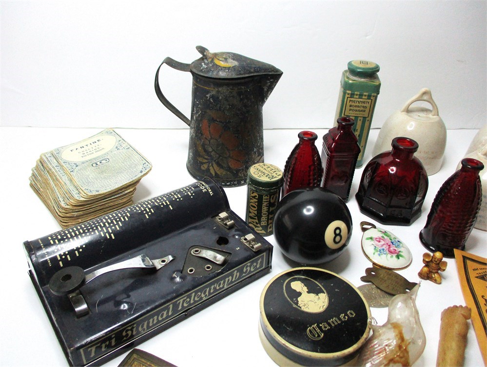 This is a wonderful Fun Discovery Lot, everything from Antique to Vintage.  Here we go....an Antique, Towle Hand-Painted Childs Tin Coffee Pot;  a ToyTri-Signal Telegraph Set w/International Codes;  2 packages of Vintage, Black Diamond Guitar Strings in original packaging with a hand-made leather pouch that also has original guitar strings; an Antique Sailor-made, bone, Crimper; a Vintage  Mennen Borated Powder Antiseptic Free Sample Tin Full; a Vintage Ramon's Brownie Pills empty tin with great graphics; 2 vintage Wheaton's red miniature glass "Old Doc's Cure bottle, a Vintage Wheaton's miniature red Apple Bitters Bottle; a Vintage Wheaton's Red Glass Carter Inkwell Bottle; a Vintage Cameo Tin that held Ribbon; an Antique, German Blown Glass Bird with Spun Glass Tail; 2 Dog Tags from New York State 1924 & 1938; an Antique Miniature Japanese Netsuke, as is;  A set of game cards from an unknown game; an Antique Brass wall plate, great for repurpose; an Antique, German Rosenthal Porcelain Pendant, signed and 4 Vintage, Porcelain Bell Samples from the W. S. George Dinnerware Company that says "It will ring up sales for you". This is a great lot, all pieces in very nice Antique/Vintage condition.