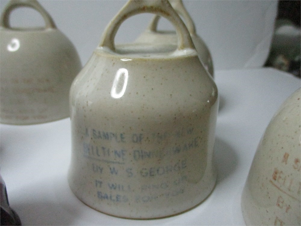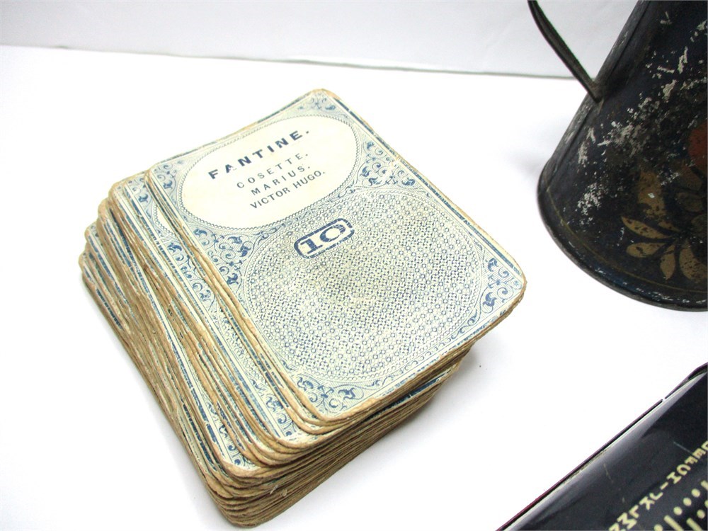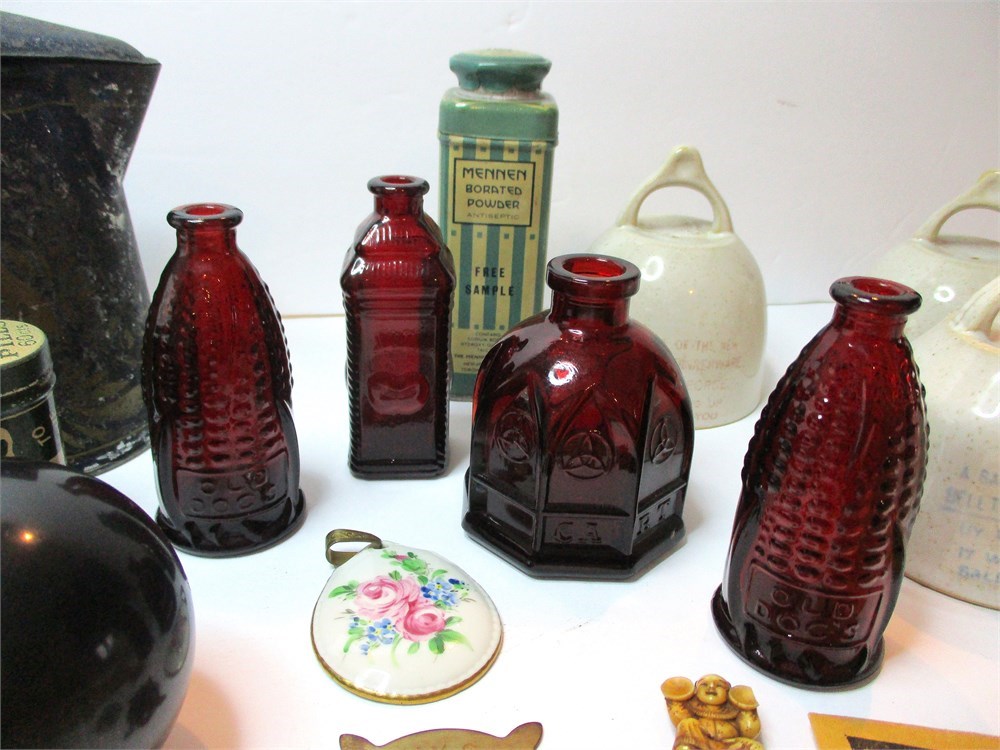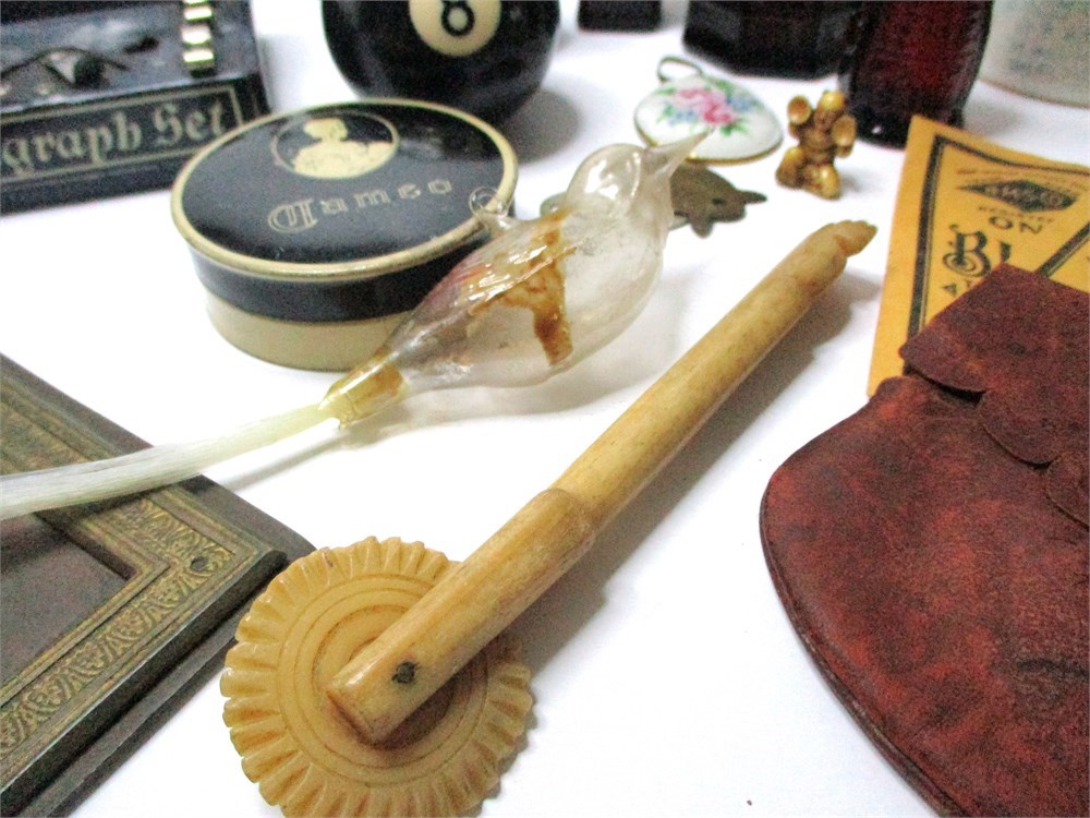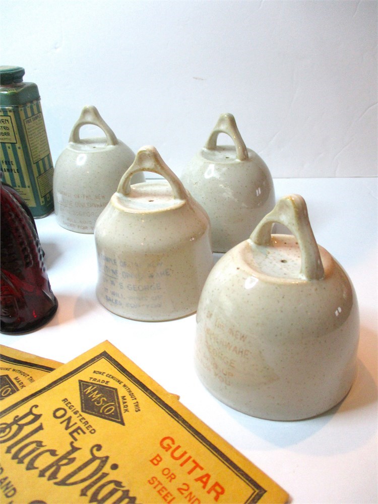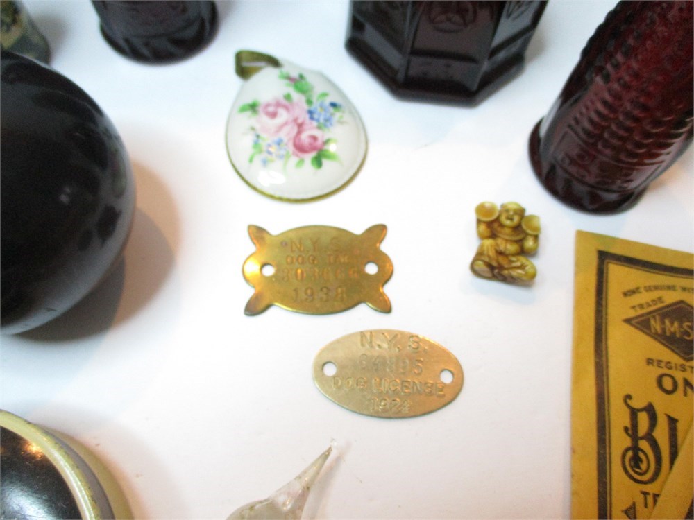 This is a wonderful Fun Discovery Lot, everything from Antique to Vintage.  Here we go....an Antique, Towle Hand-Painted Childs Tin Coffee Pot;  a ToyTri-Signal Telegraph Set w/International Codes;  2 packages of Vintage, Black Diamond Guitar Strings in original packaging with a hand-made leather pouch that also has original guitar strings; an Antique Sailor-made, bone, Crimper; a Vintage  Mennen Borated Powder Antiseptic Free Sample Tin Full; a Vintage Ramon's Brownie Pills empty tin with great graphics; 2 vintage Wheaton's red miniature glass "Old Doc's Cure bottle, a Vintage Wheaton's miniature red Apple Bitters Bottle; a Vintage Wheaton's Red Glass Carter Inkwell Bottle; a Vintage Cameo Tin that held Ribbon; an Antique, German Blown Glass Bird with Spun Glass Tail; 2 Dog Tags from New York State 1924 & 1938; an Antique Miniature Japanese Netsuke, as is;  A set of game cards from an unknown game; an Antique Brass wall plate, great for repurpose; an Antique, German Rosenthal Porcelain Pendant, signed and 4 Vintage, Porcelain Bell Samples from the W. S. George Dinnerware Company that says "It will ring up sales for you". This is a great lot, all pieces in very nice Antique/Vintage condition.