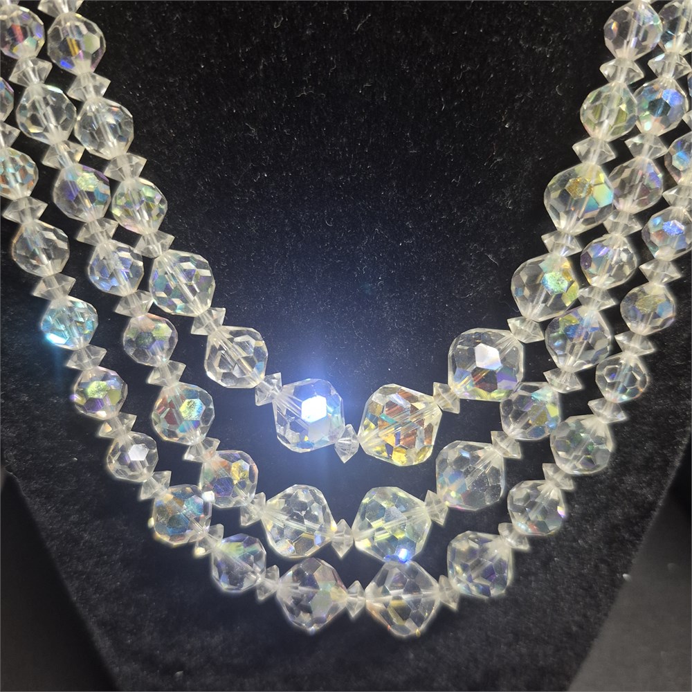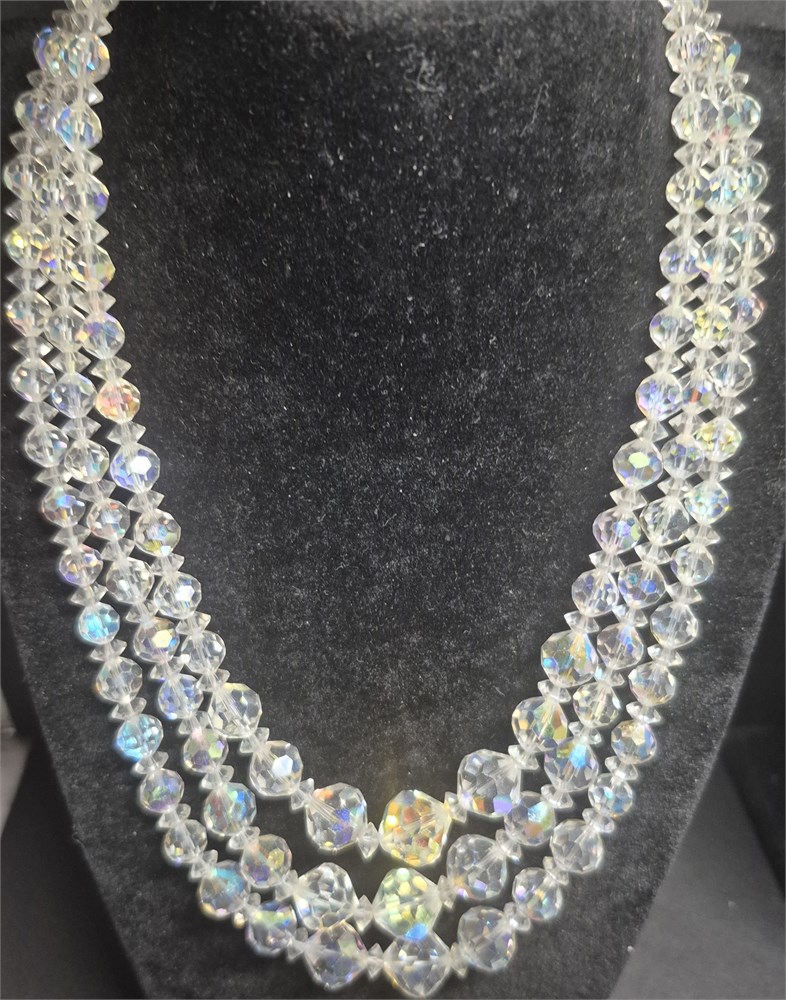 3 Strands Aurora Crystal Sparkling clear Necklace Estate [v]
