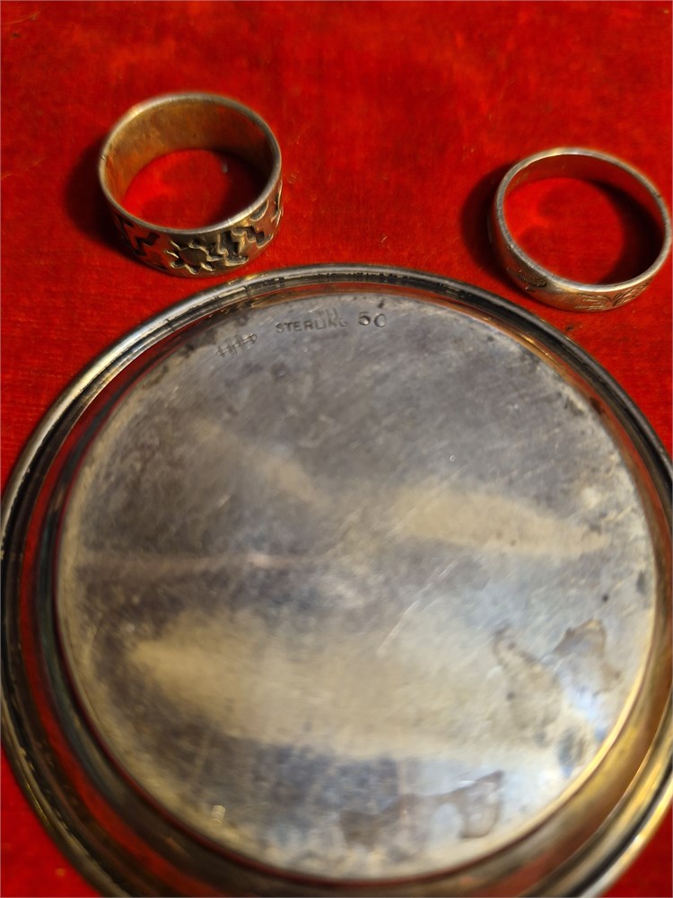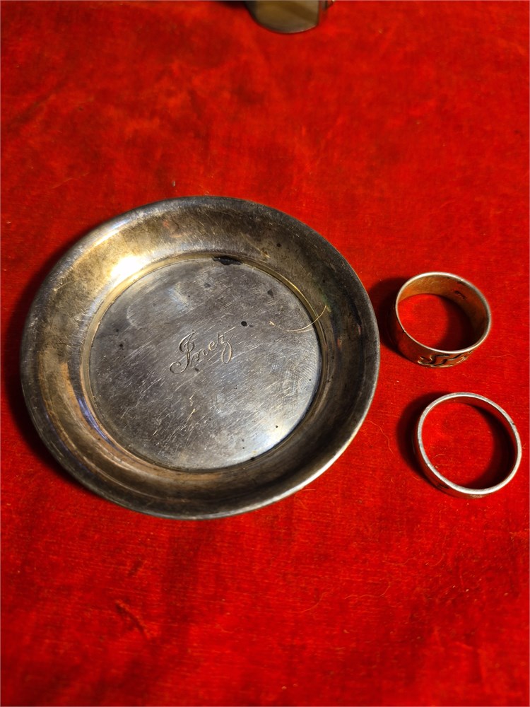 Pair o sterling silver rings and small, sterling silver trinket dish. Total weight is 27.66 grams