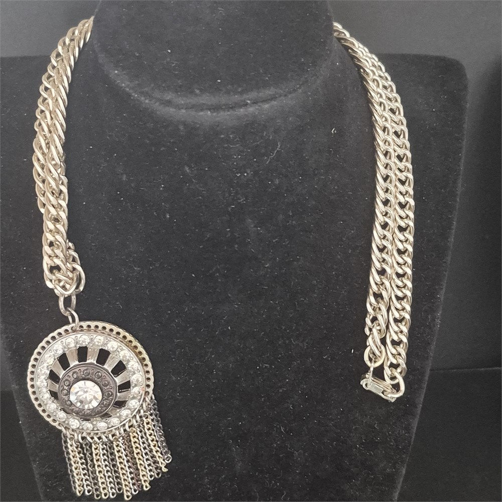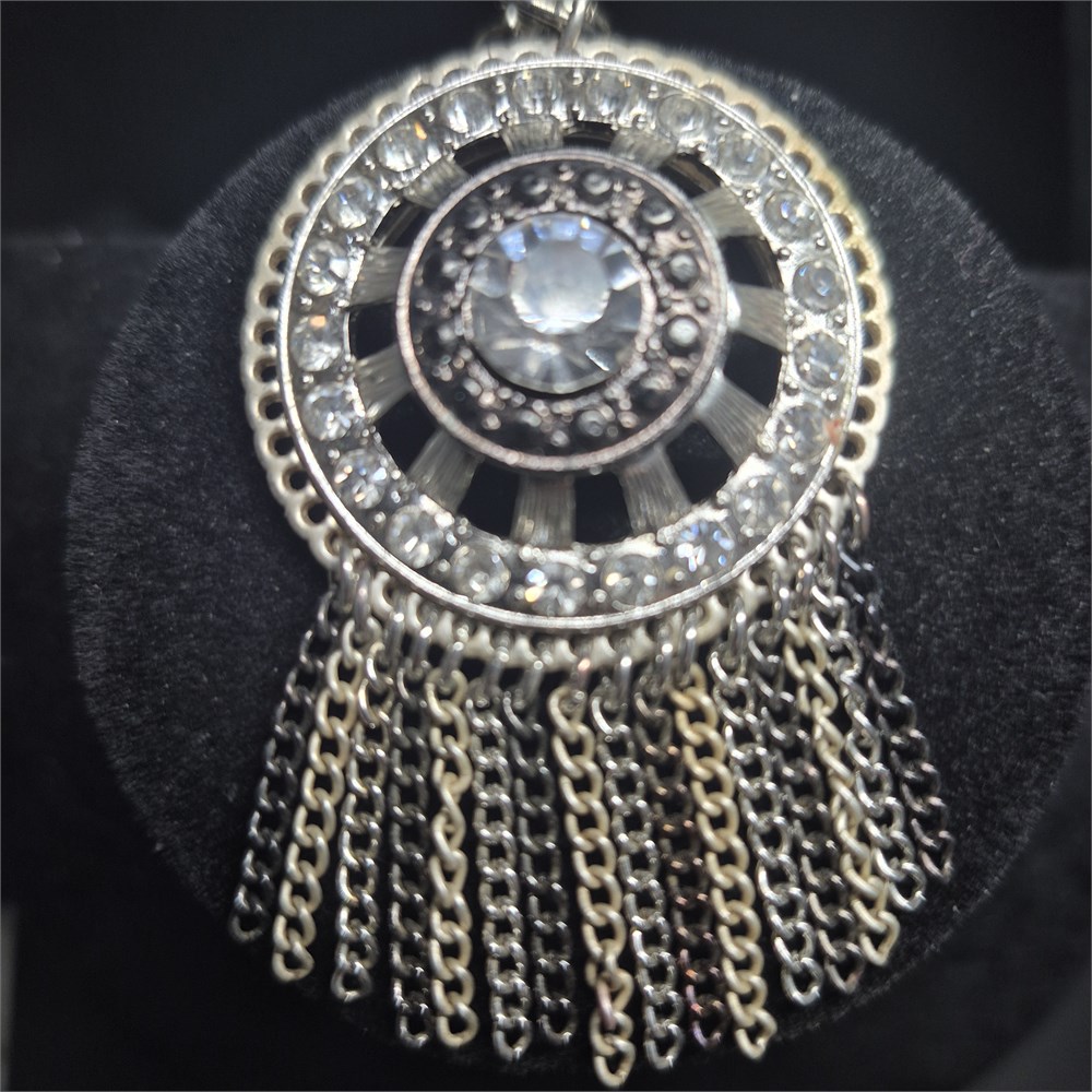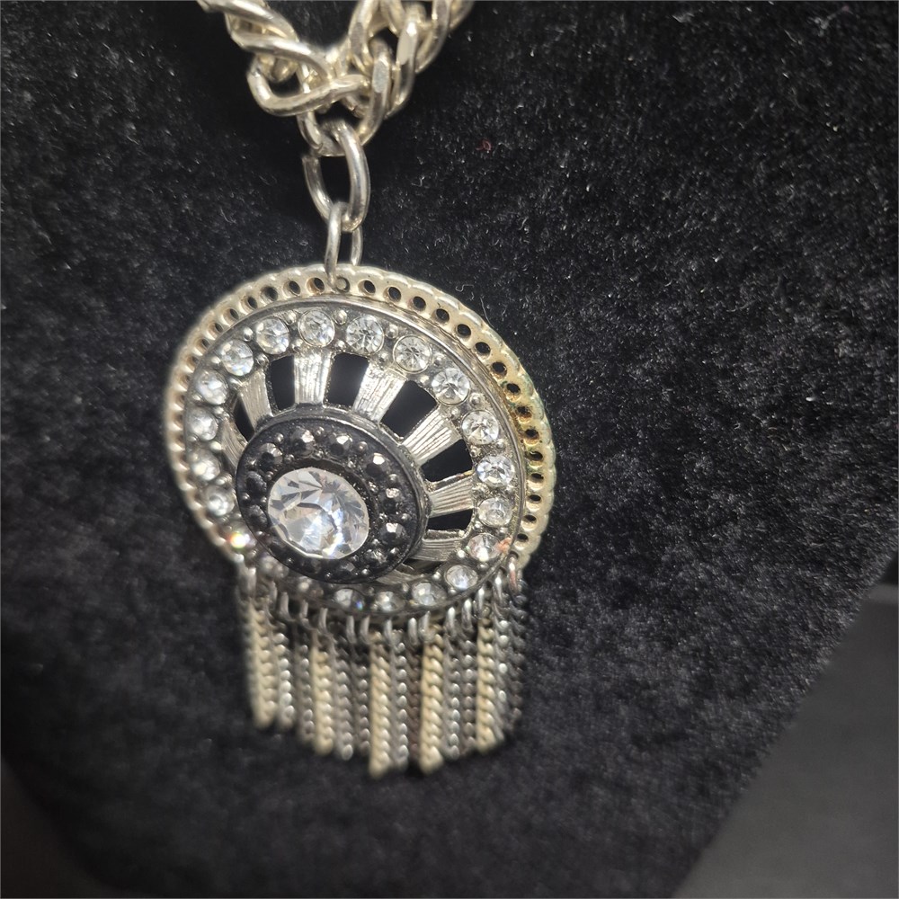 > Necklace is a large circle rhinestone pendant w/ 12" heavy link chain