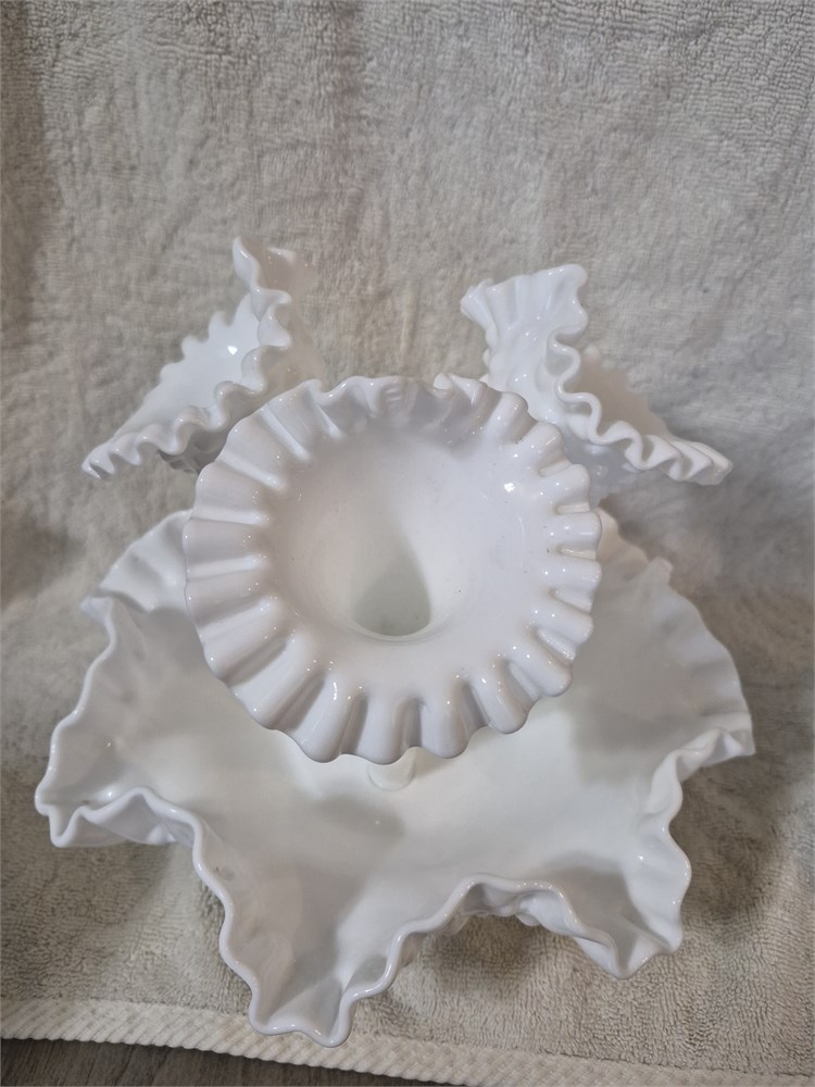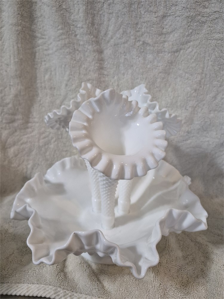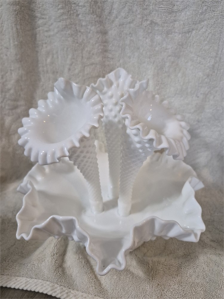 Fenton Vintage Diamond Lace Hobnail White Milk Glass 4-piece Epergne Triple Vase.