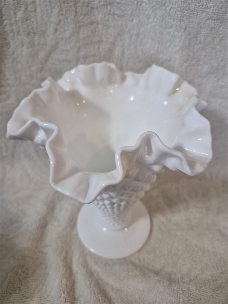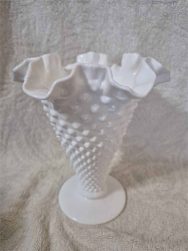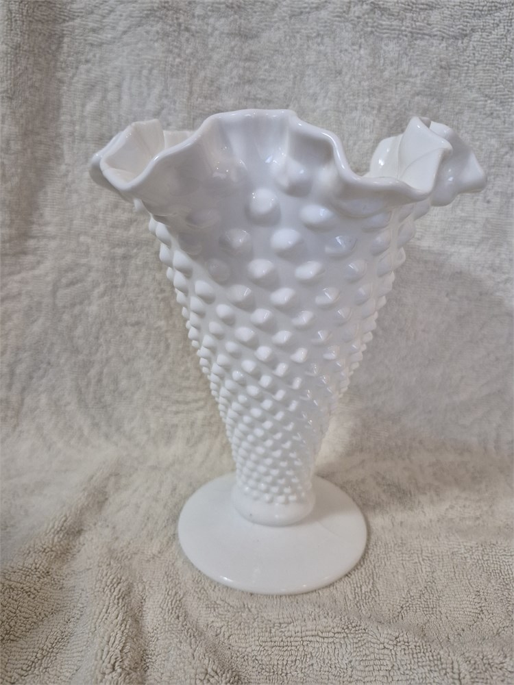 Fenton Vase White Milk Glass 8" Footed Trumpet Ruffled Rim Hobnail Vintage USA