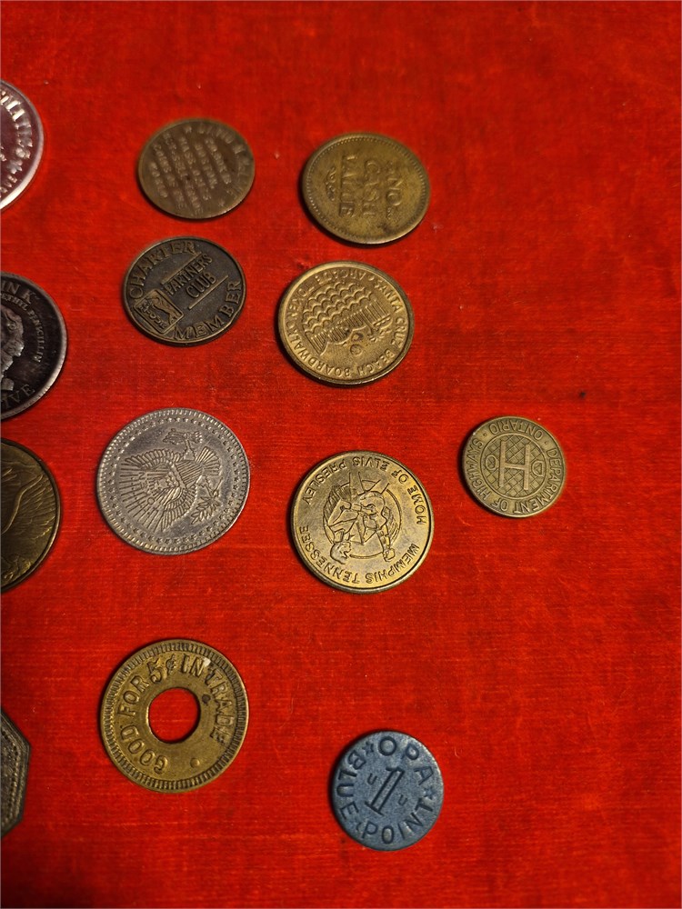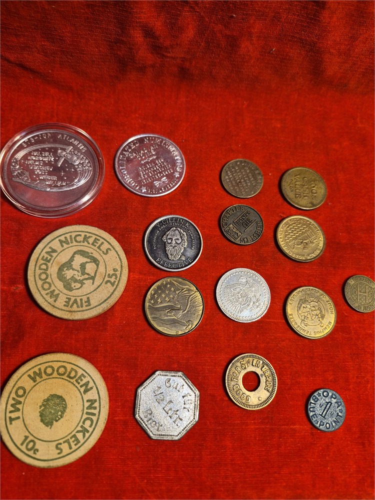16 different kinds of tokens and Coins. You includes wooden nickels, atlantis, plastic, trade, coins and others.