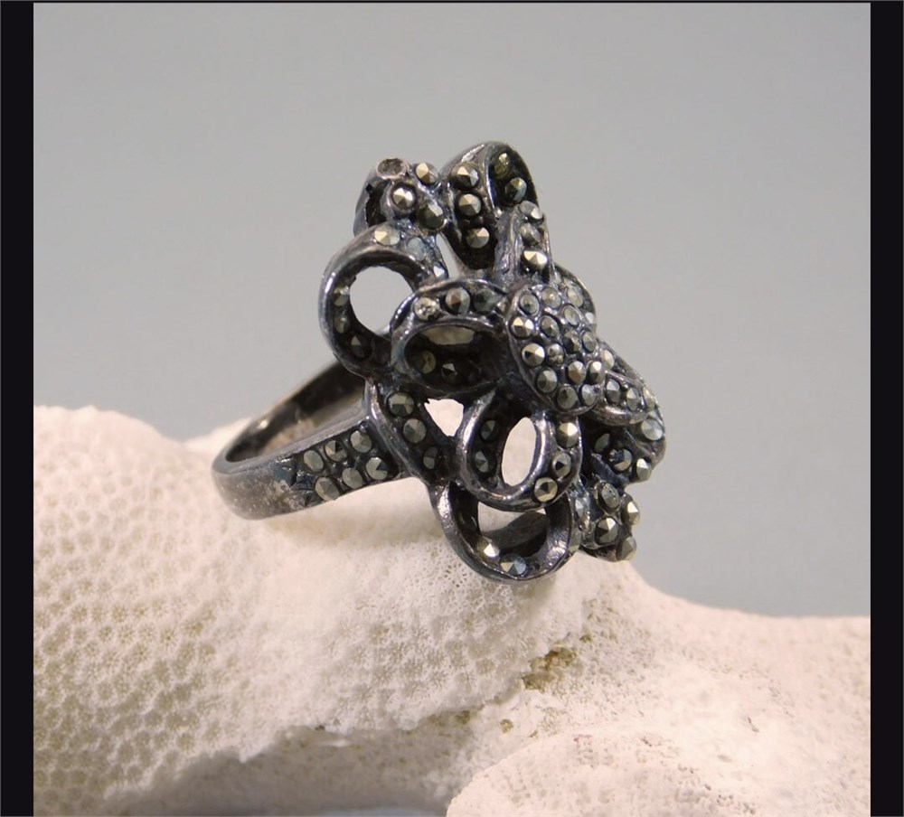 The intricate design is dotted with sparkling marcasite in sterling that has a deep patina. This ring is a heavy and well made vintage ring. Ring measures 7/8 inch front to back and about 1/2 inch side to side.