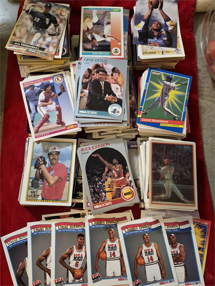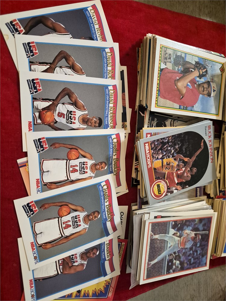 Large Lot of 1990s baseball, basketball and football cards. Includes Charles Barkley and David Robinson 1992 USA Olypic Cards. Approximately 300 cards.