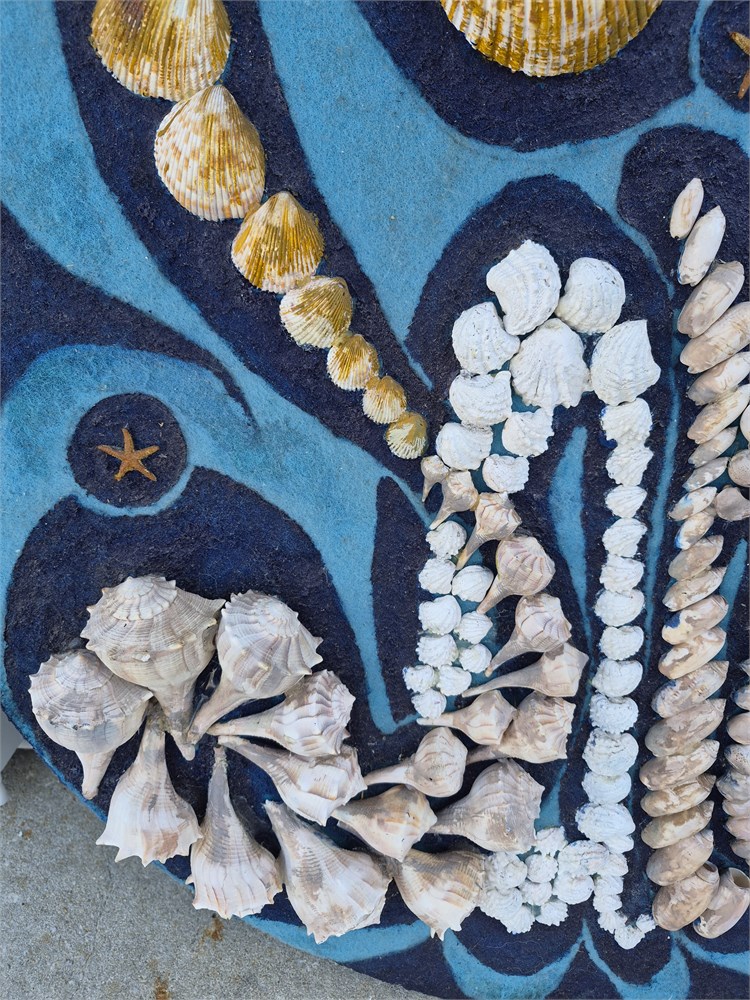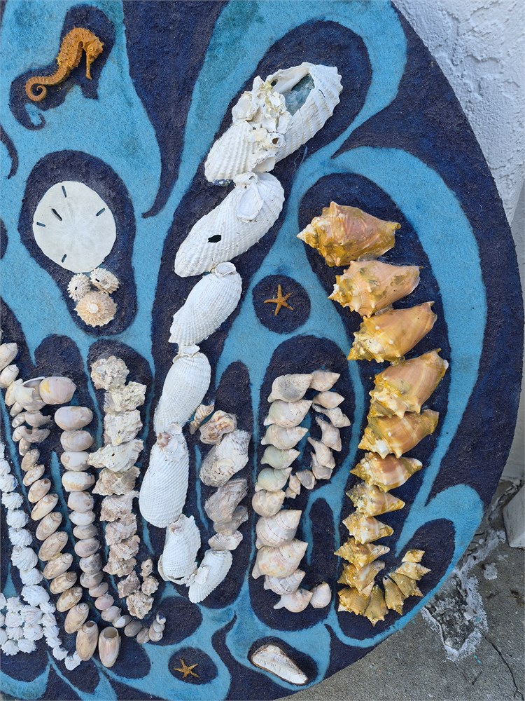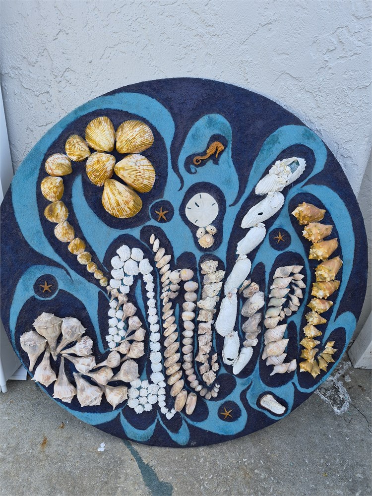 Nice large shell art on wood. Items is approximately 30" across center. Spells Sanibel. Some great shell used to make this piece.