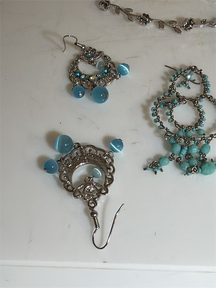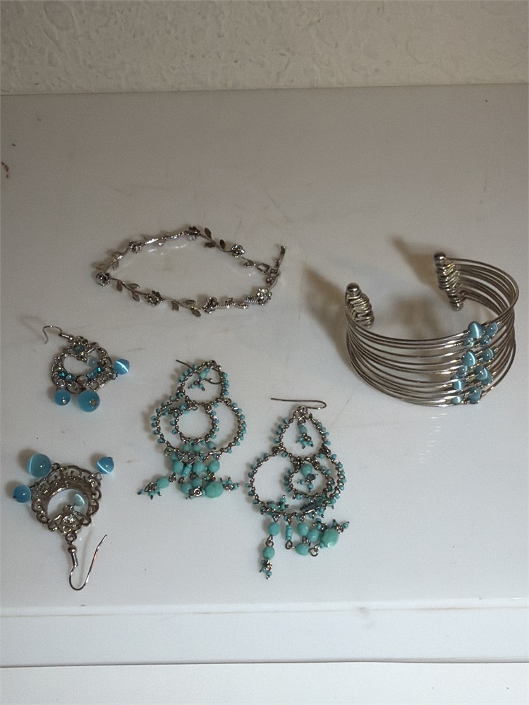 Faux Turquoise Mix & Match Necklace Bracelet Set Silver Tone Bangles (L)