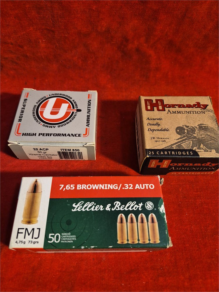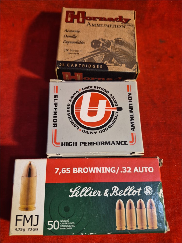 3 boxes of .32 ammo. 1 50 ct box Lellier & Bellot. 1 25ct box by Hornady and 1 box 25 ct by Underwwod.