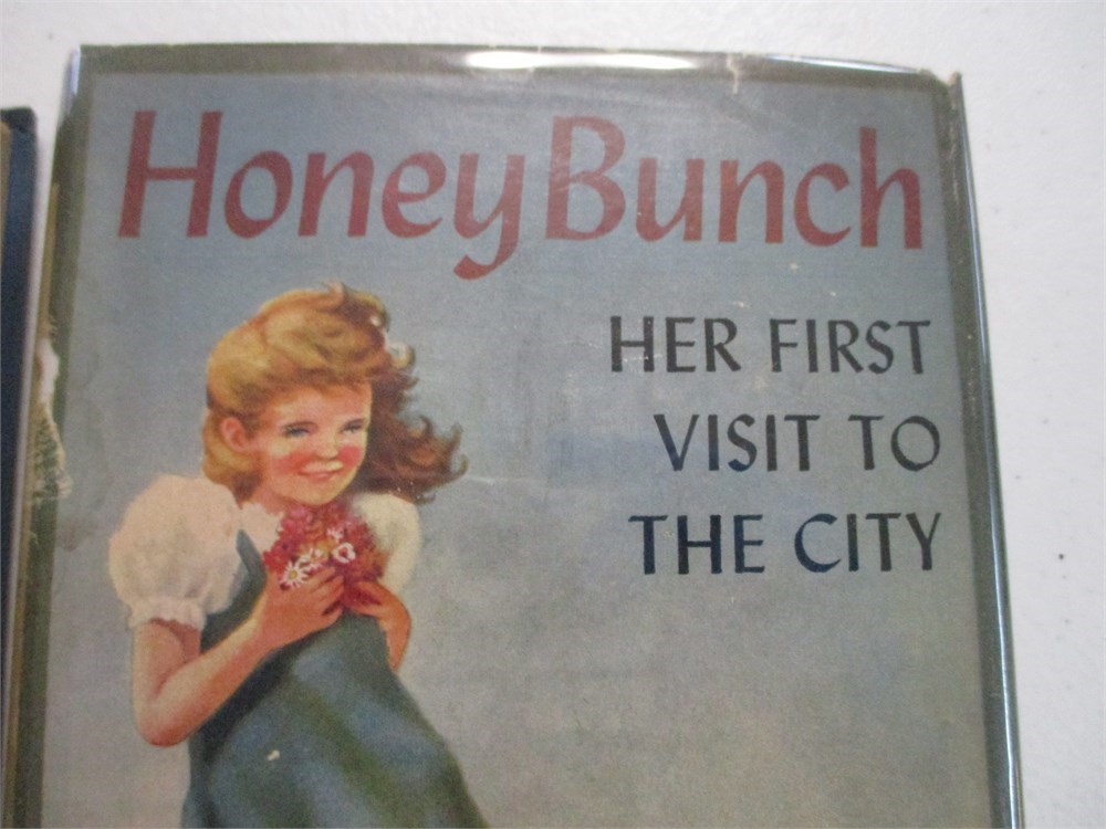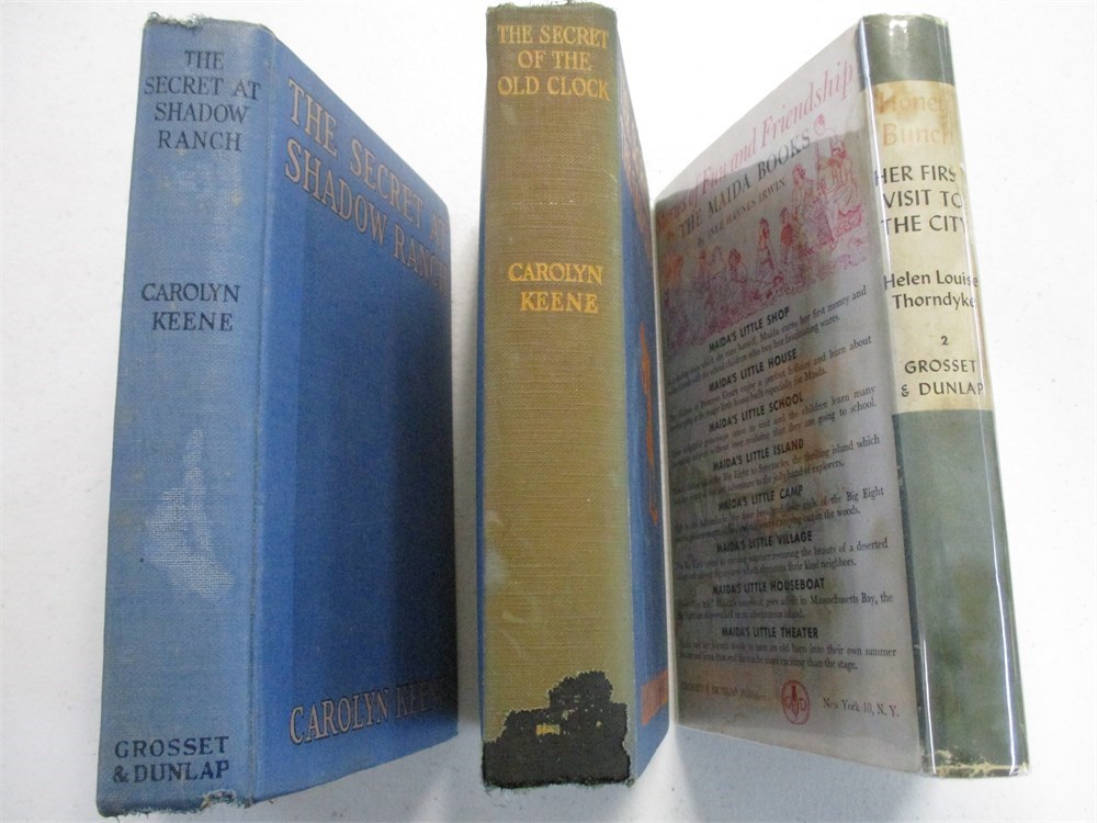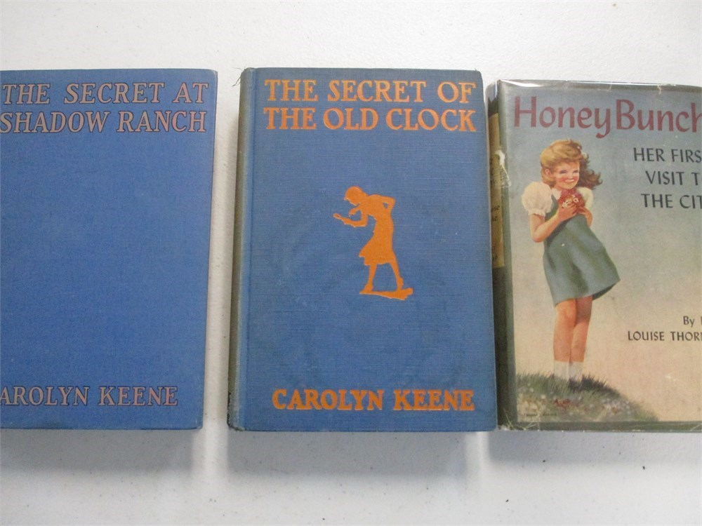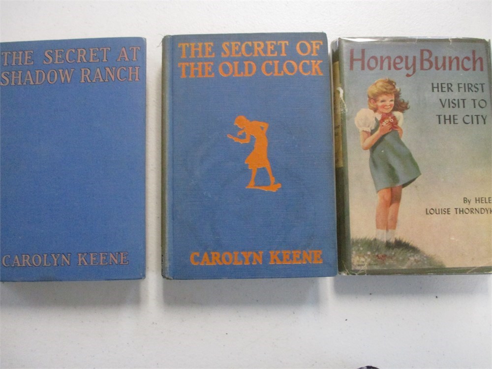 3 Book Lot; HoneyBunch her first visit to the city, The Secret of the Old Clock, The Secret At Shadow Ranch.  By Thorndike and Keene.  All books have some binding issues and discoloration.