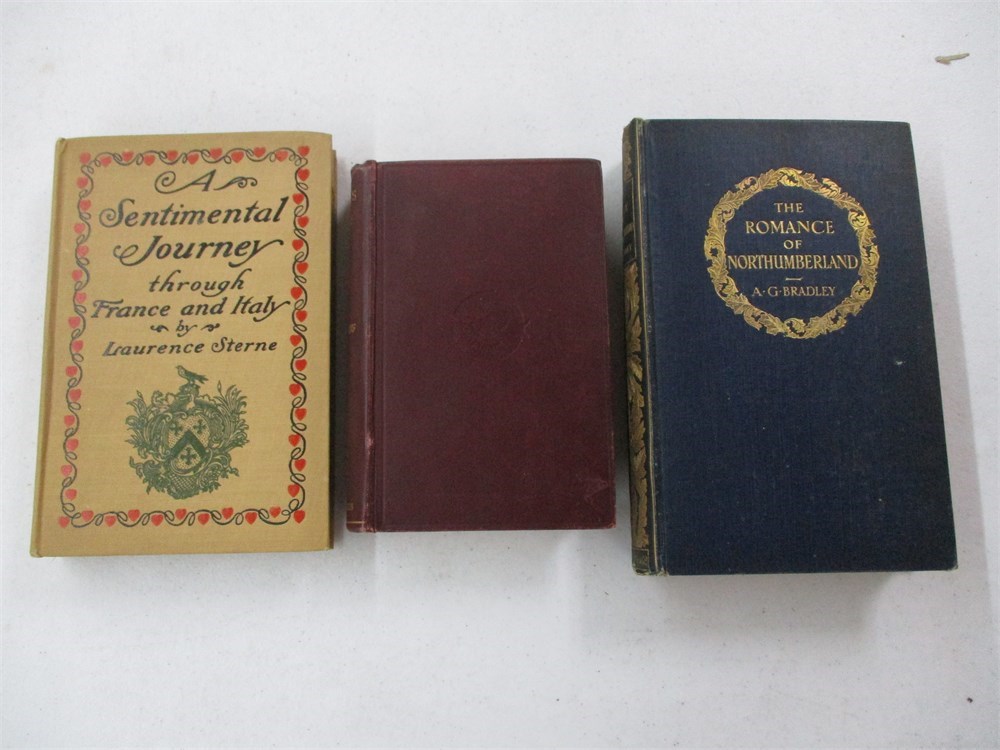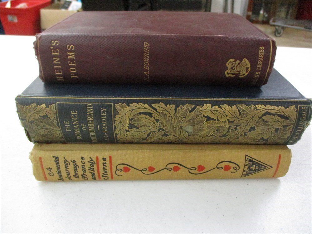 3 Book Lot;  A Sentimental Journey through France and Italy, Heine's Poems, The Romance of Northumberland.  All of these books are in good used condition only showing normal age related wear to the spines and normal yellowing of the pages due to age and light.  Lovely embossing on the cover and spine of The Romance of Northumberland.