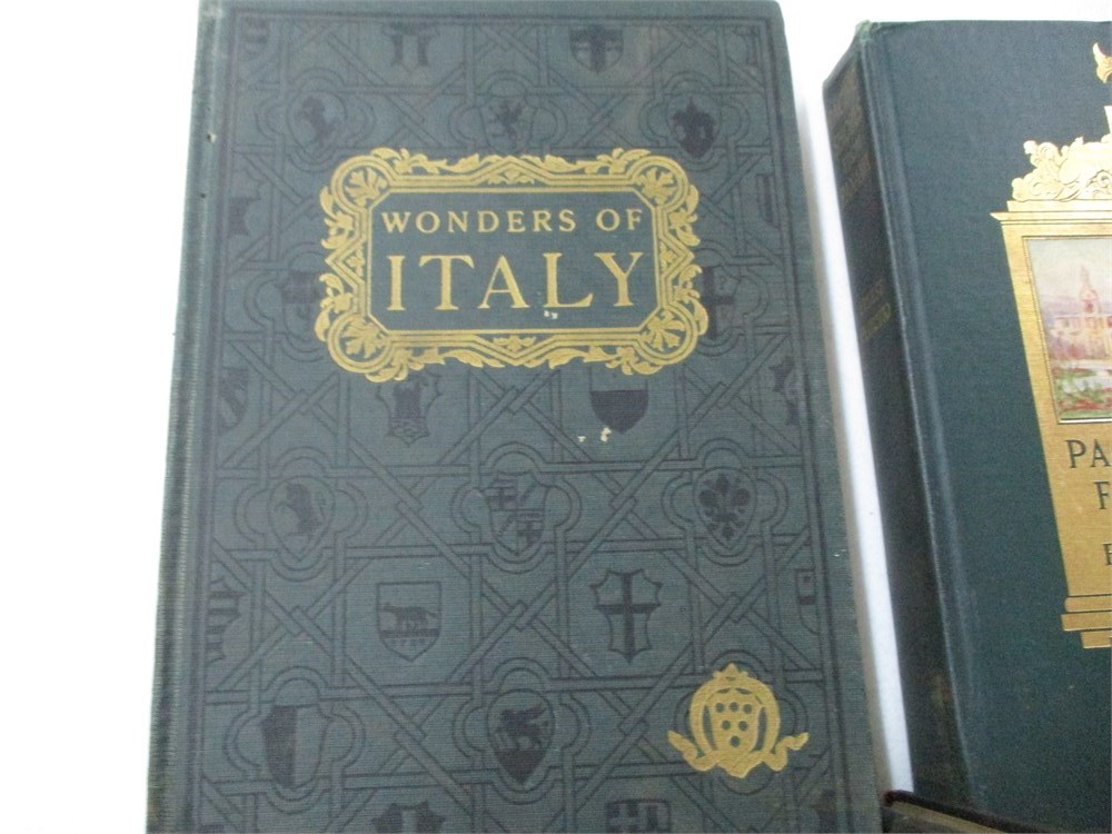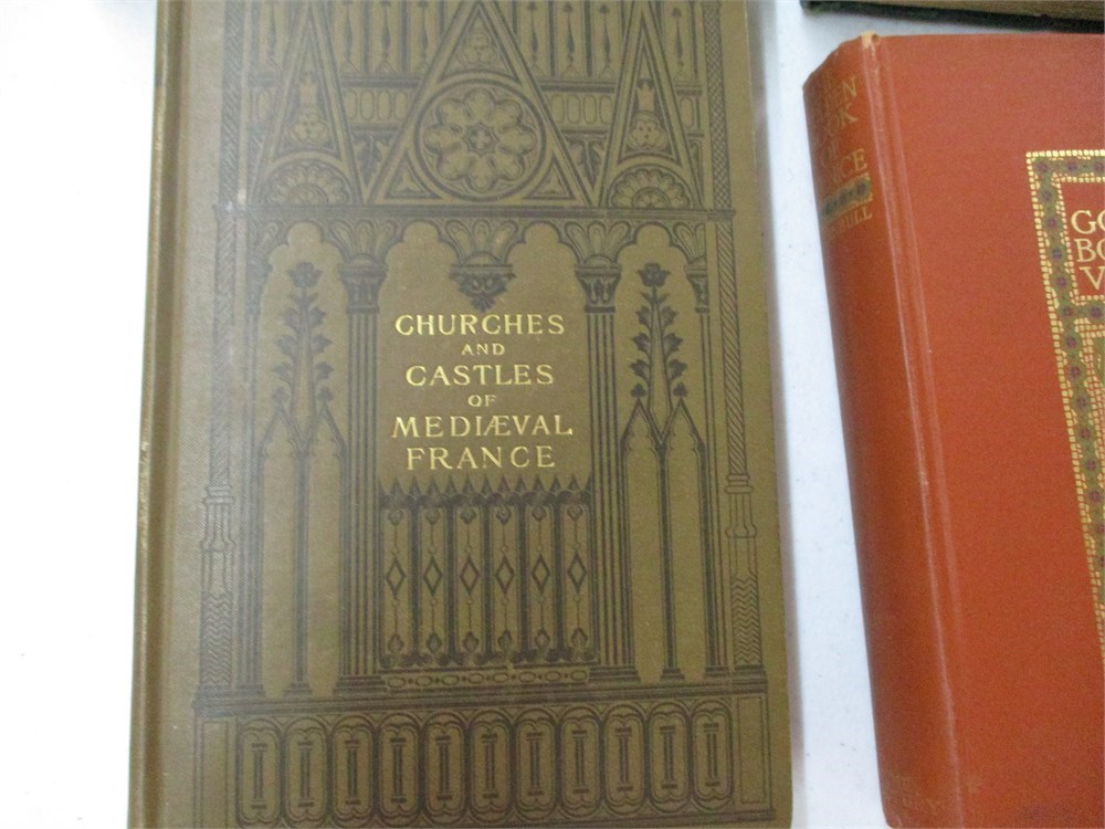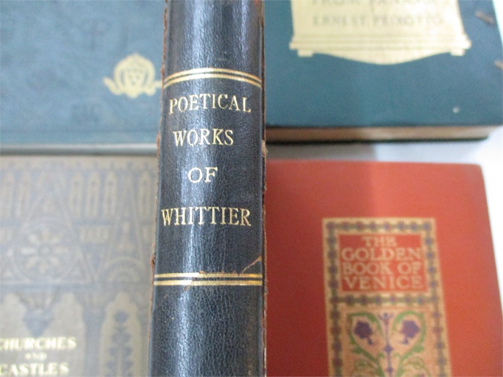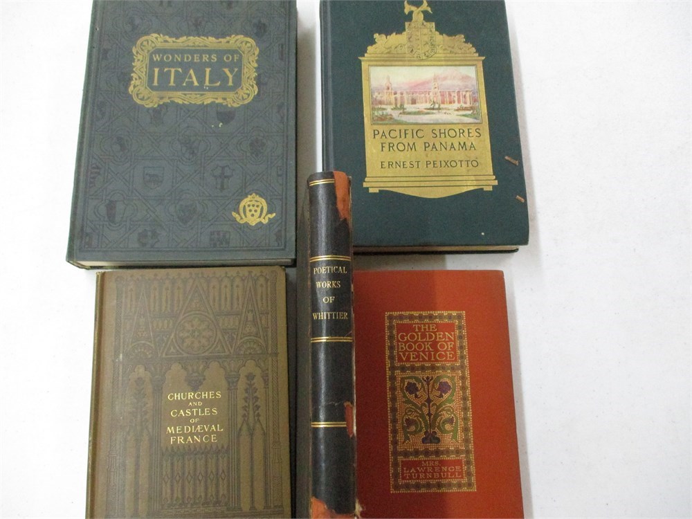 5 Book Lot; Churches and Castles of Mediaeval France, Golden Book of Venice, Pacific Shores of Panama, Wonders of Italy & Poetical Works of Whittier.  All books are in good vintage condition but the Poetical works of Whittier has issues.