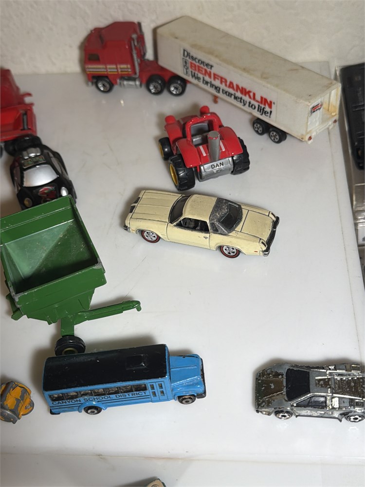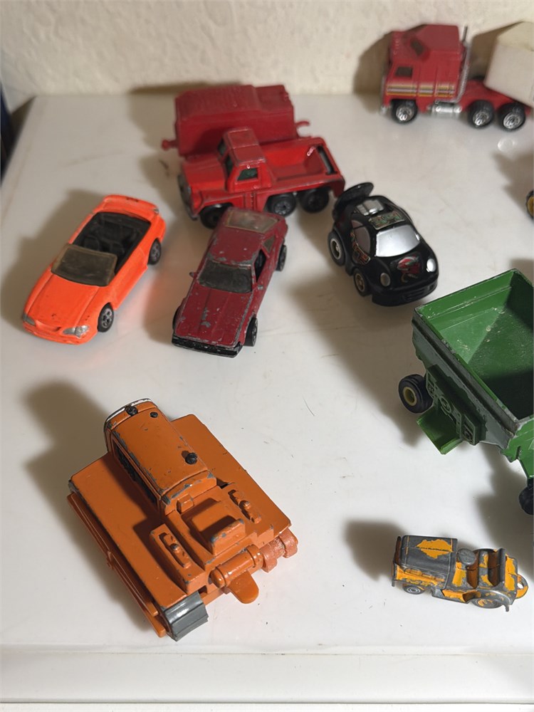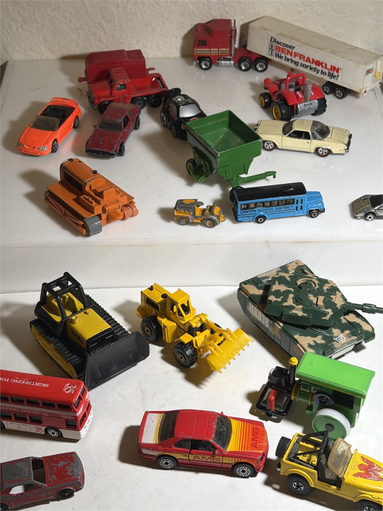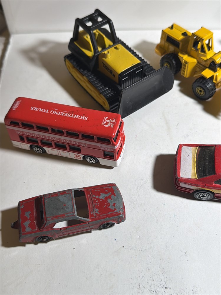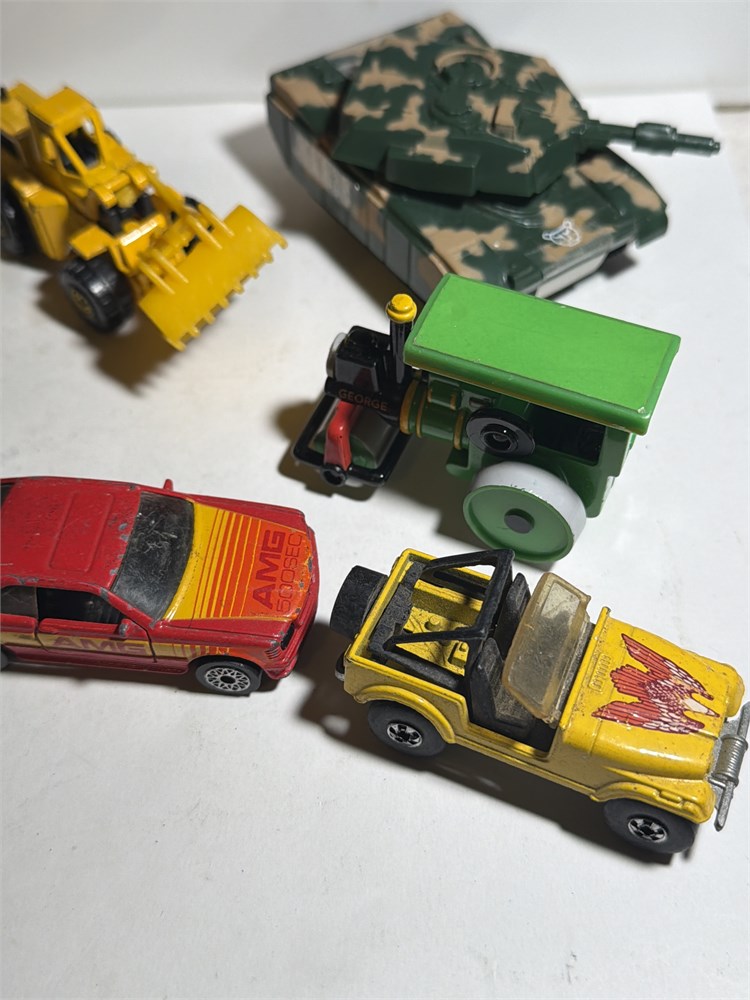 Village collectibles, jeep cars, antique metal cars, Ferdinand, loaders, dozer, tanks, old diesel, tractor, miniature school, bus, and much more 21 pieces total