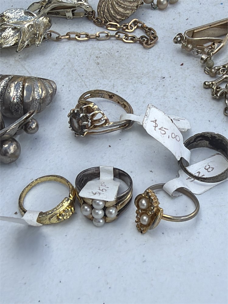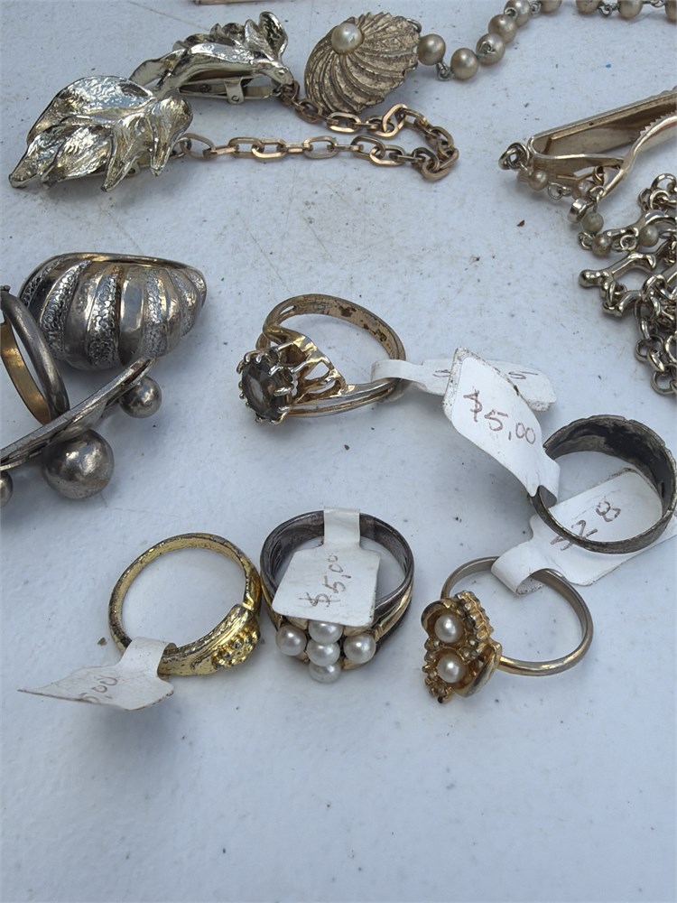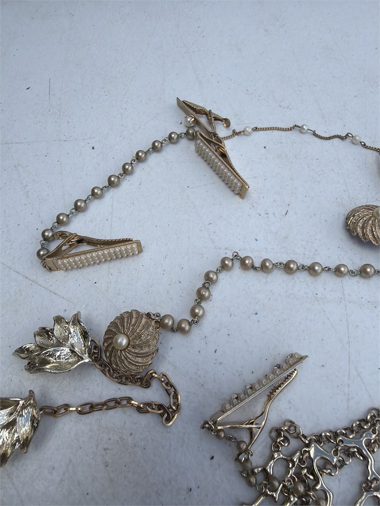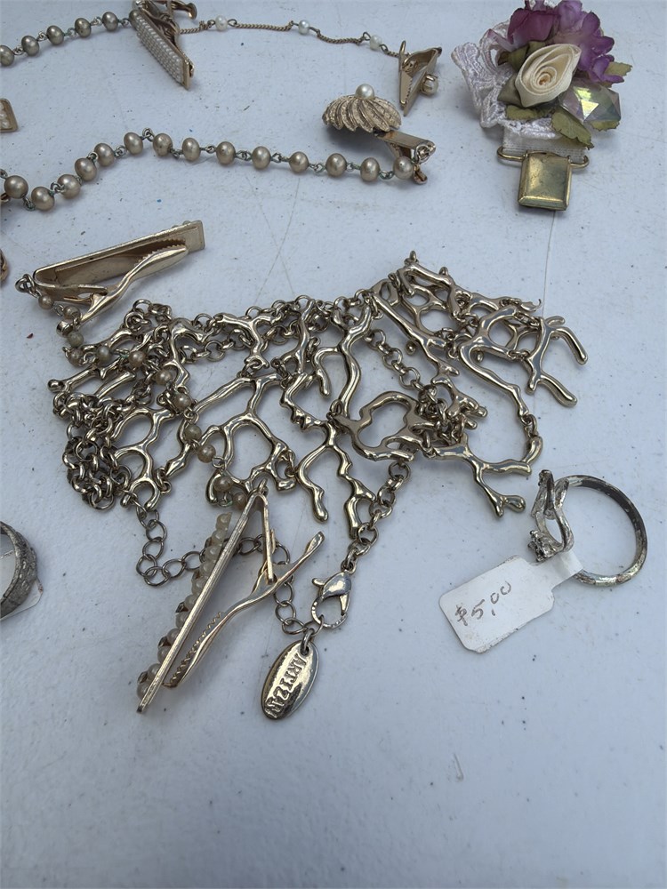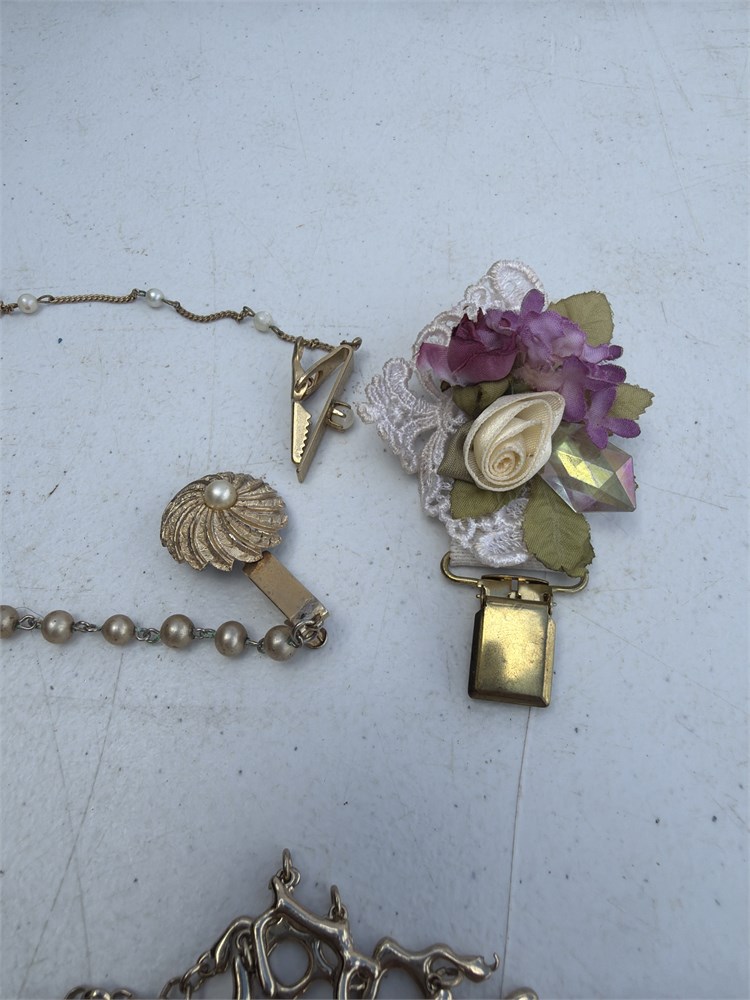 Vintage assortment Tie pins rings and necklaces, gold tans silver tone