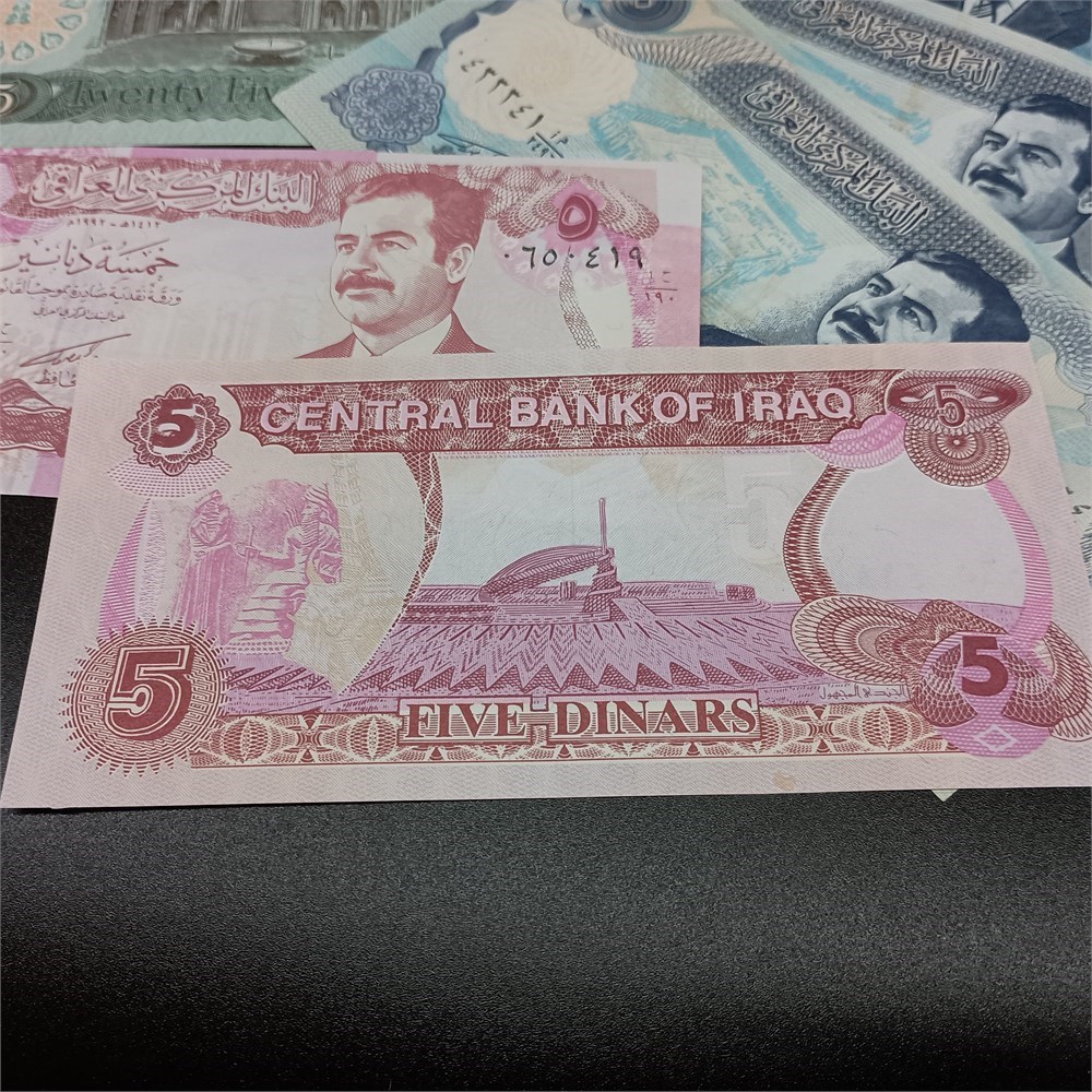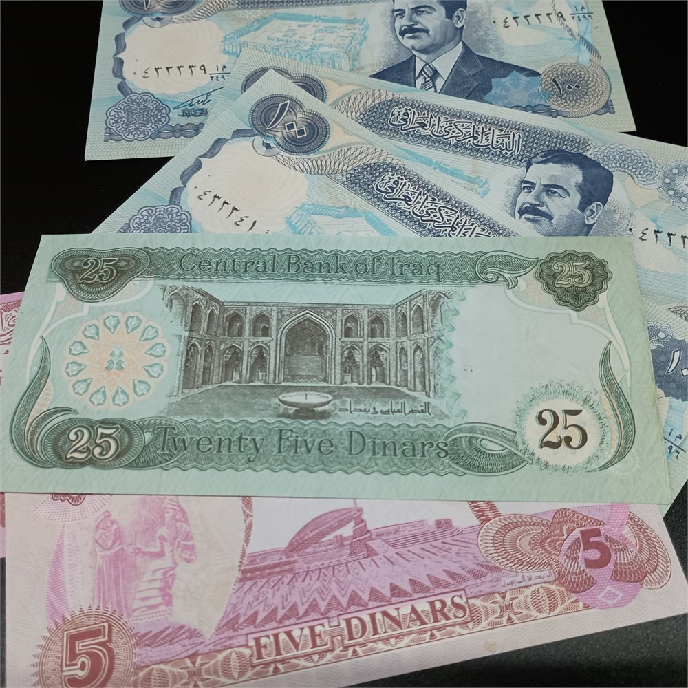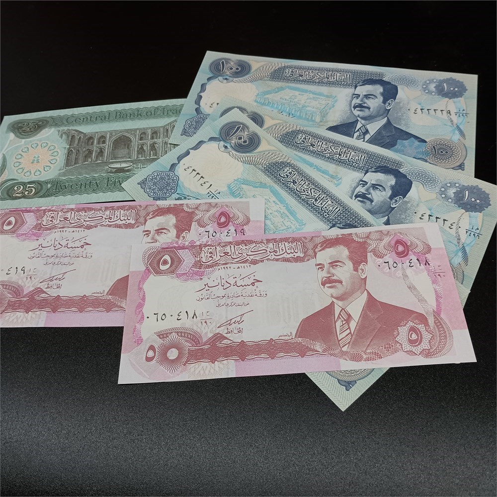 Group of paper money probably Gulf War era.  335 Dinars total.  In uncirculated condition.  May have monetary value or suitable for framing.