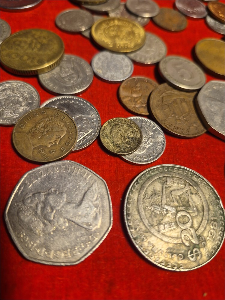 Nice lot of foreign coins. Look to be from italy, Mexico.and Great Britain.