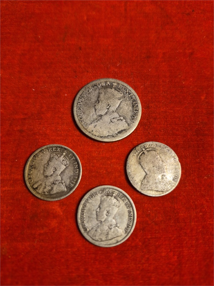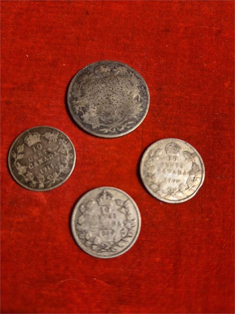 Lot of four early 1900s Canadian 80% Silver Coins. 1 quarter and 3 Dimes.