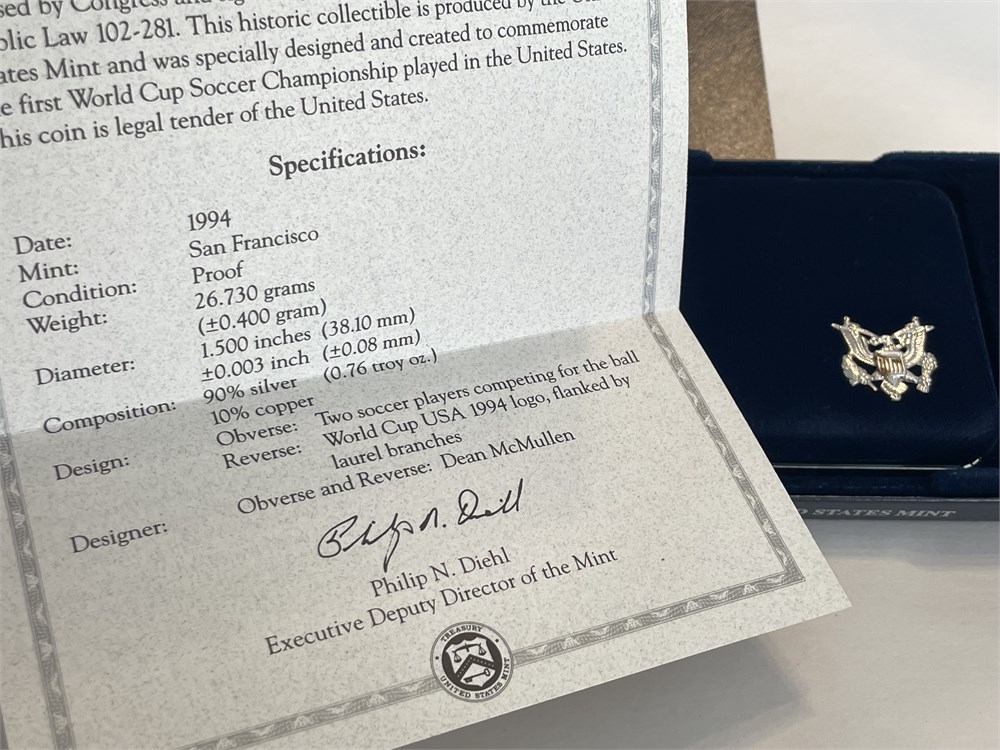 1994 World Cup USA Proof Silver Dollar, 90% silver, 26.73 grams