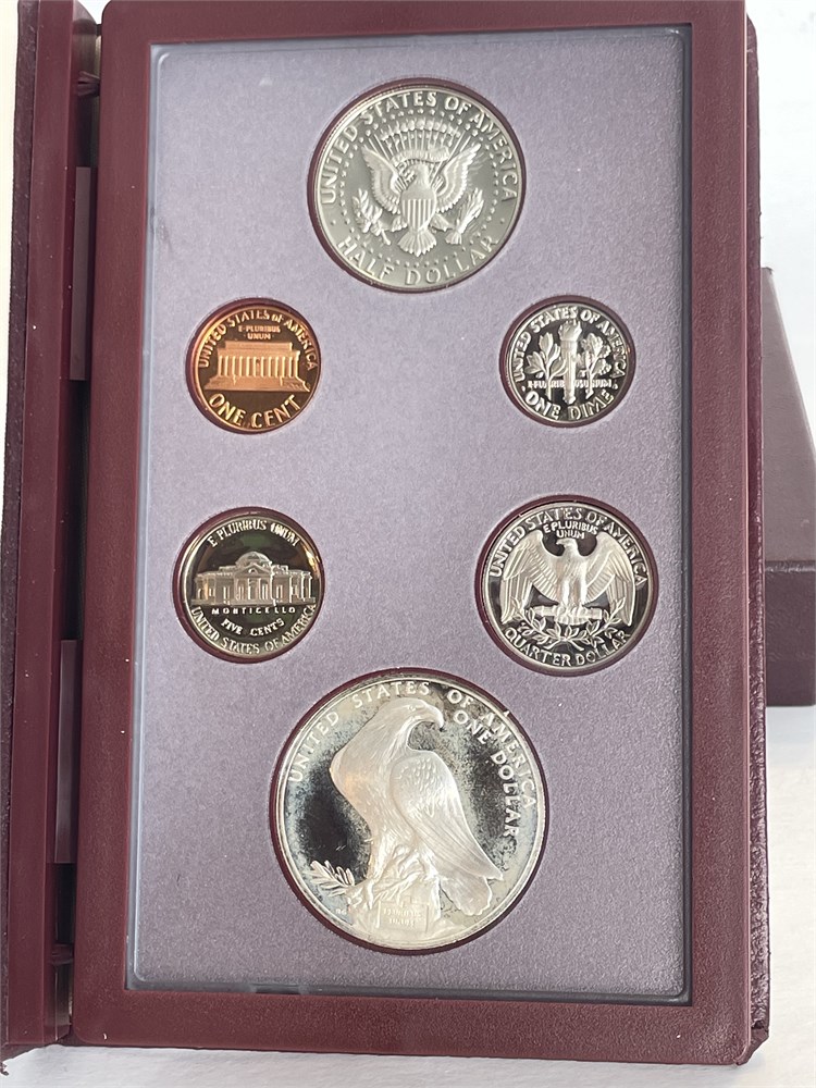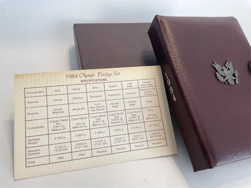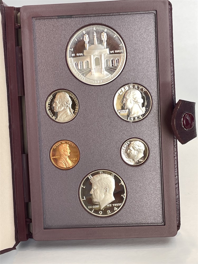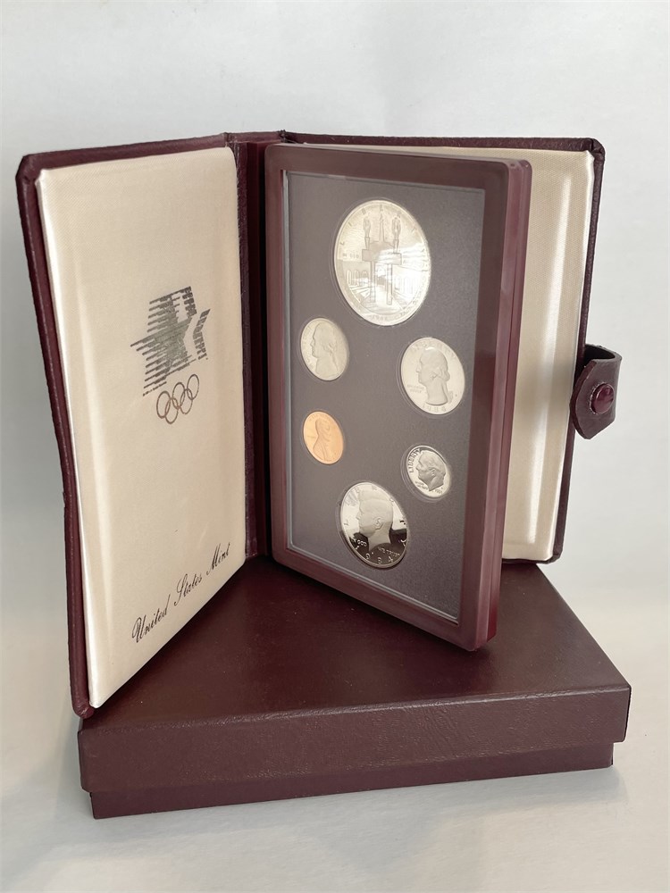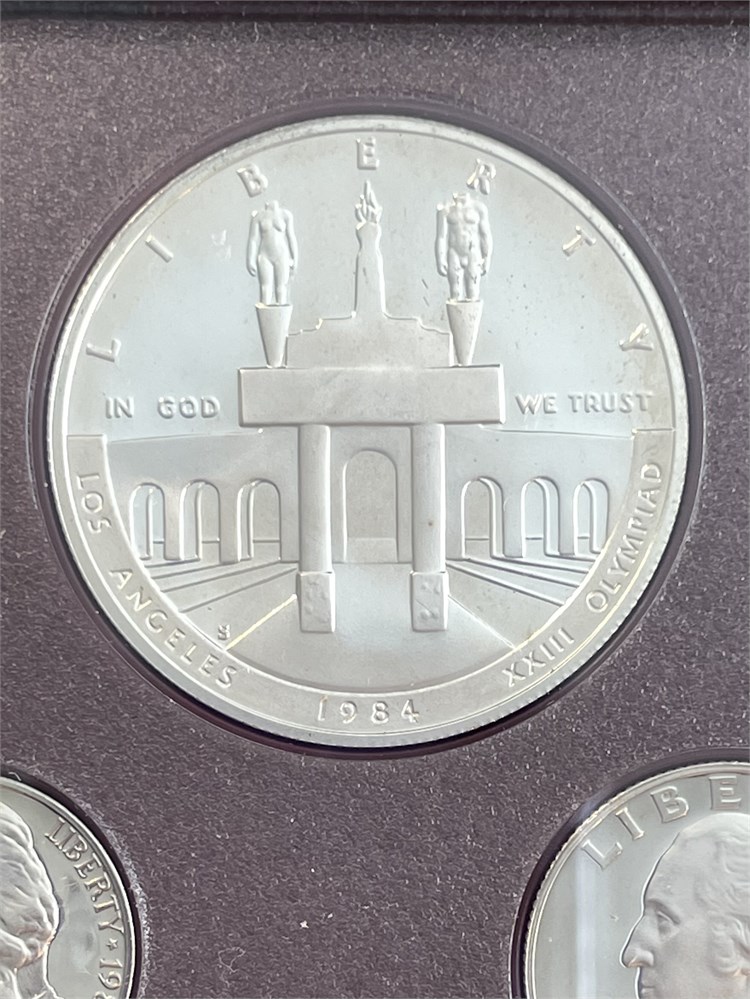 1984 L.A. Olympics Prestige Set with a 90% Silver Dollar and five other coins.