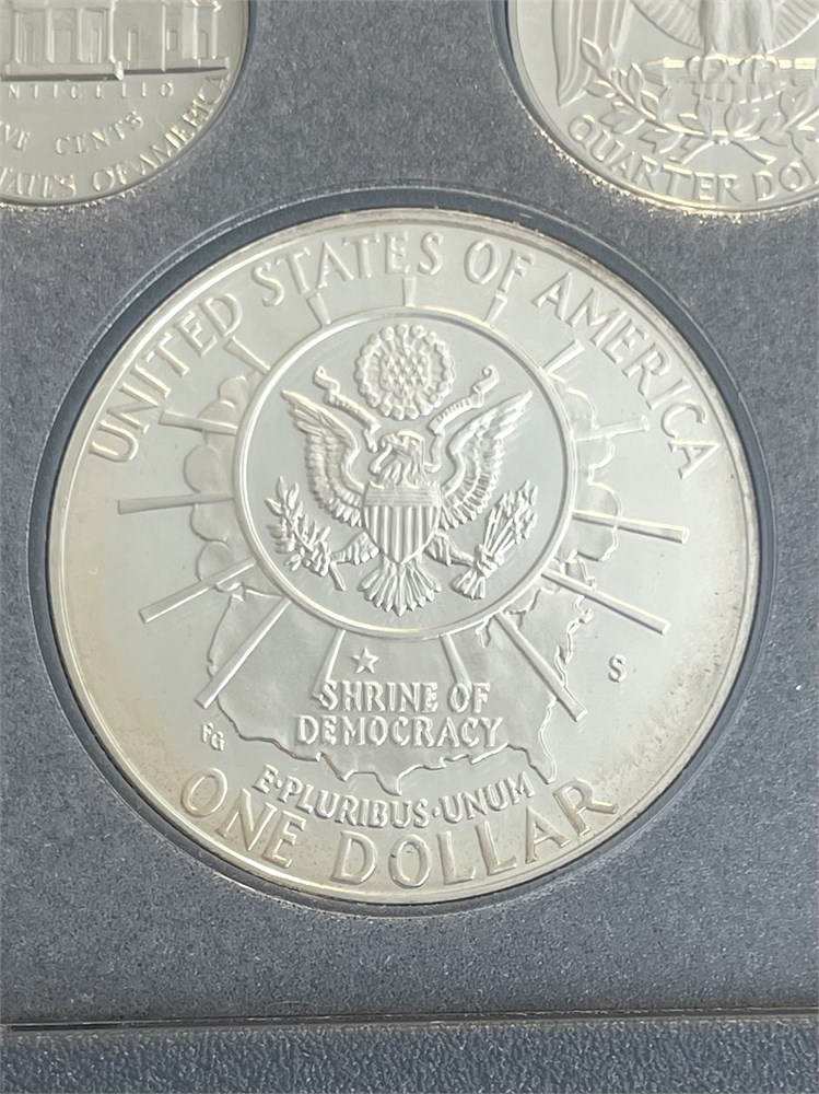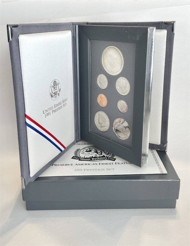 1991 Mount Rushmore 50th Anniversary Prestige Set, with a 90% Silver Dollar and five other coins.