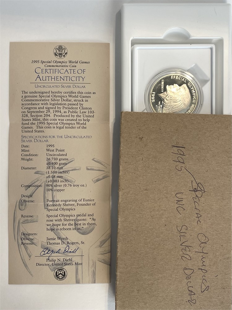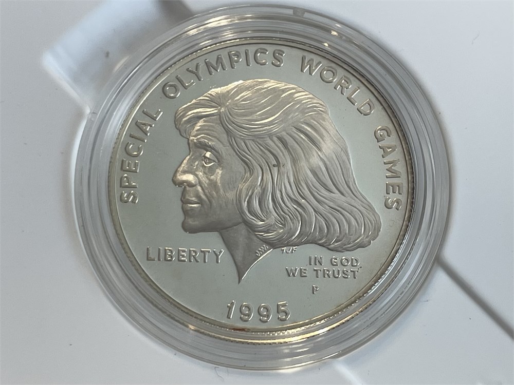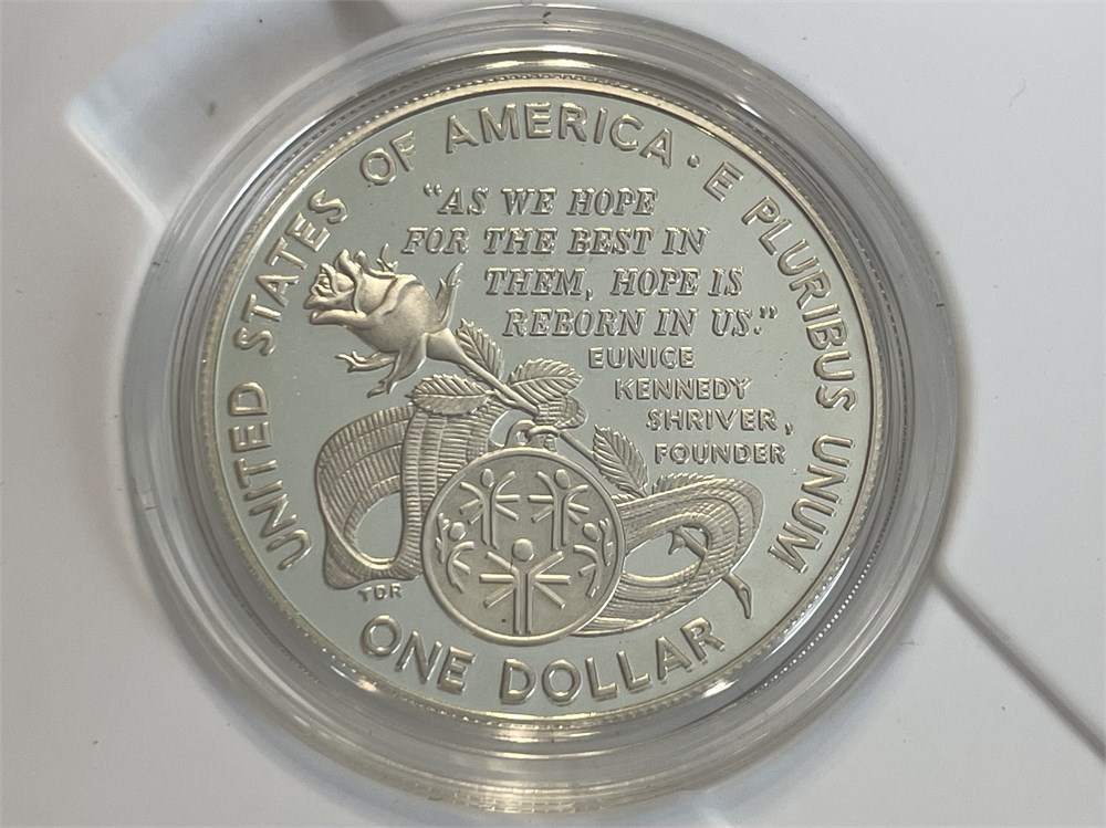 1995 Special Olympics World Games Silver Dollar Coin, Eunice Shriver, 90% silver, 26.73 grams