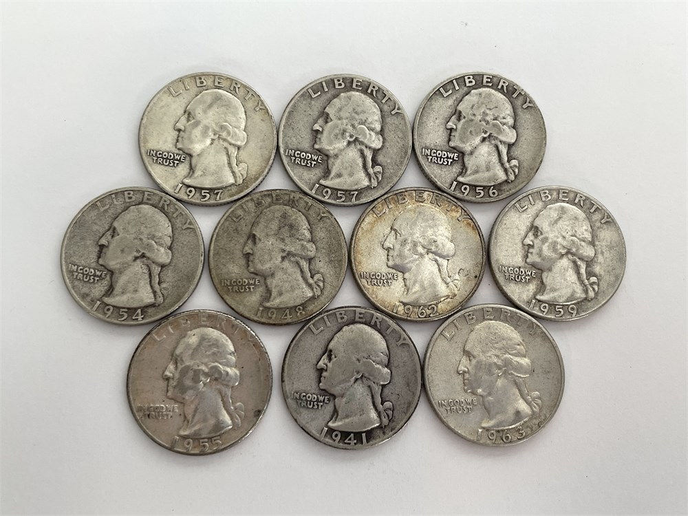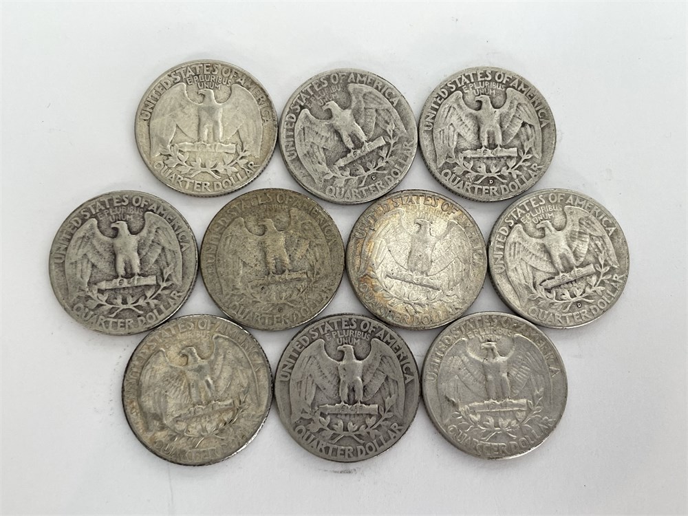 10 U.S. Silver Quarters, assorted dates and conditions as shown in photos.