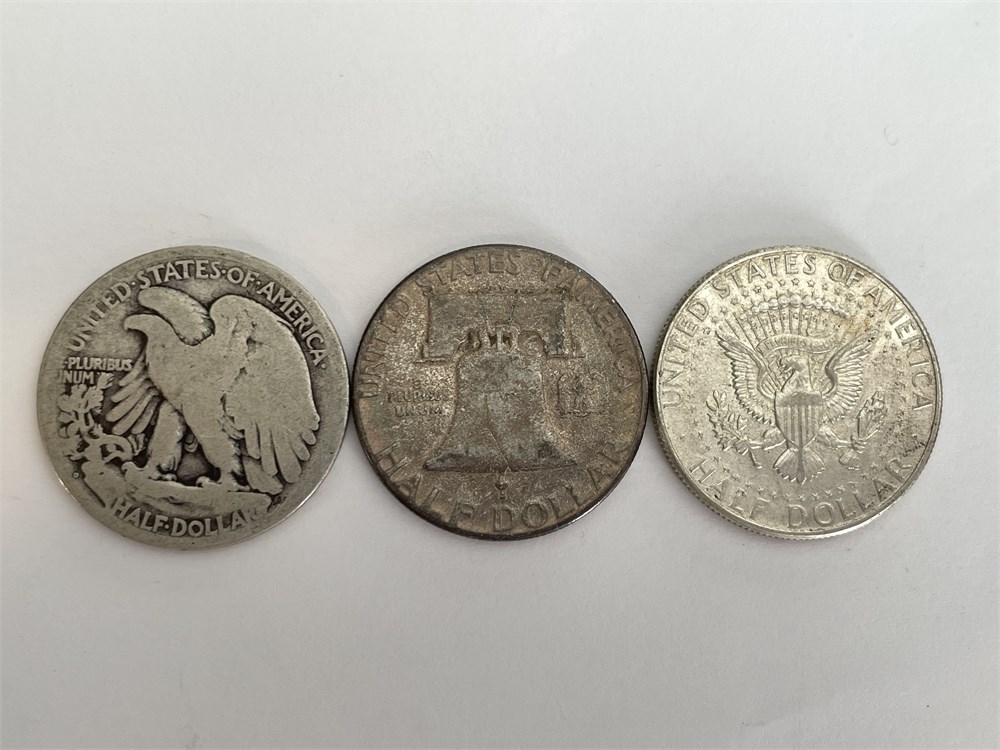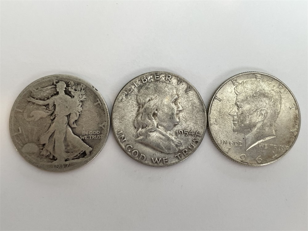 3 Silver Half Dollars: 1917 D Liberty, 1954 P Franklin, 1964 P Kennedy