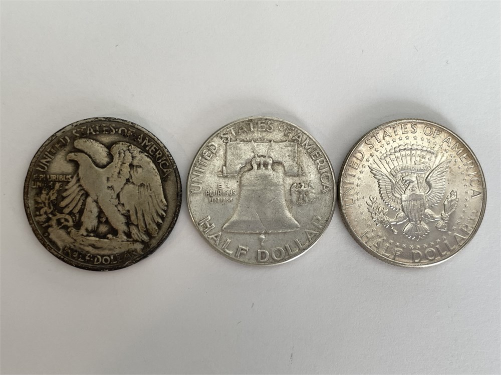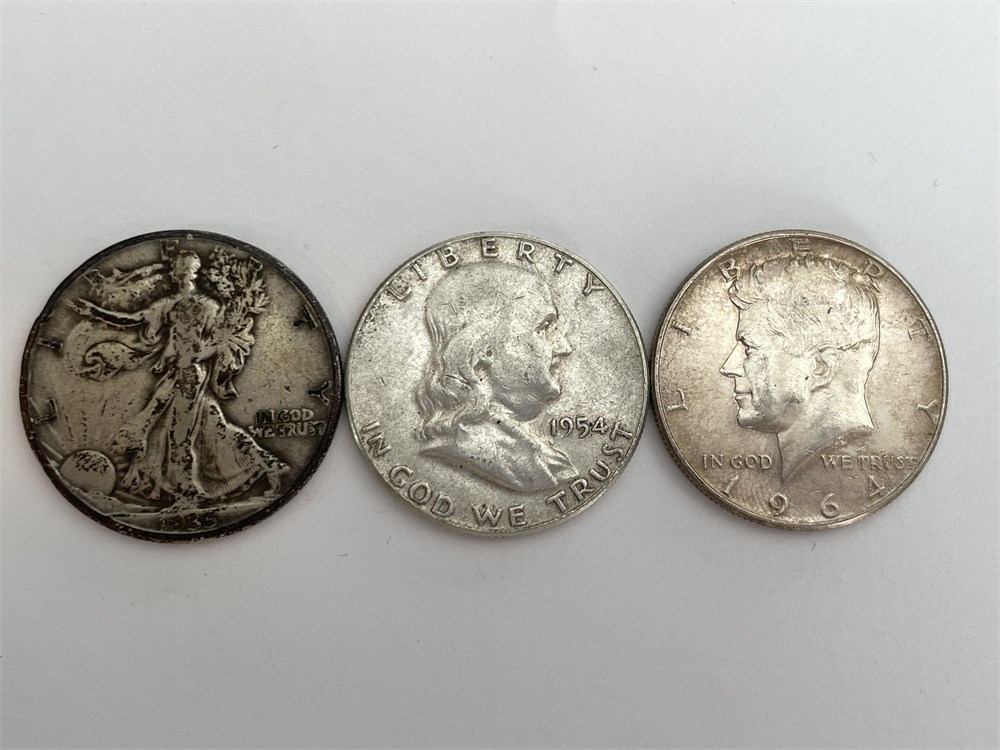 3 Silver Half Dollars: 1935 D Liberty, 1954 P Franklin, 1964 P Kennedy