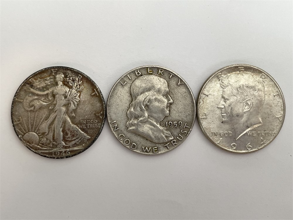 3 Silver Half Dollars: 1946 S Liberty, 1959 P Franklin, 1964 P Kennedy