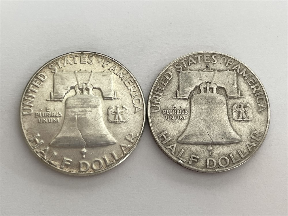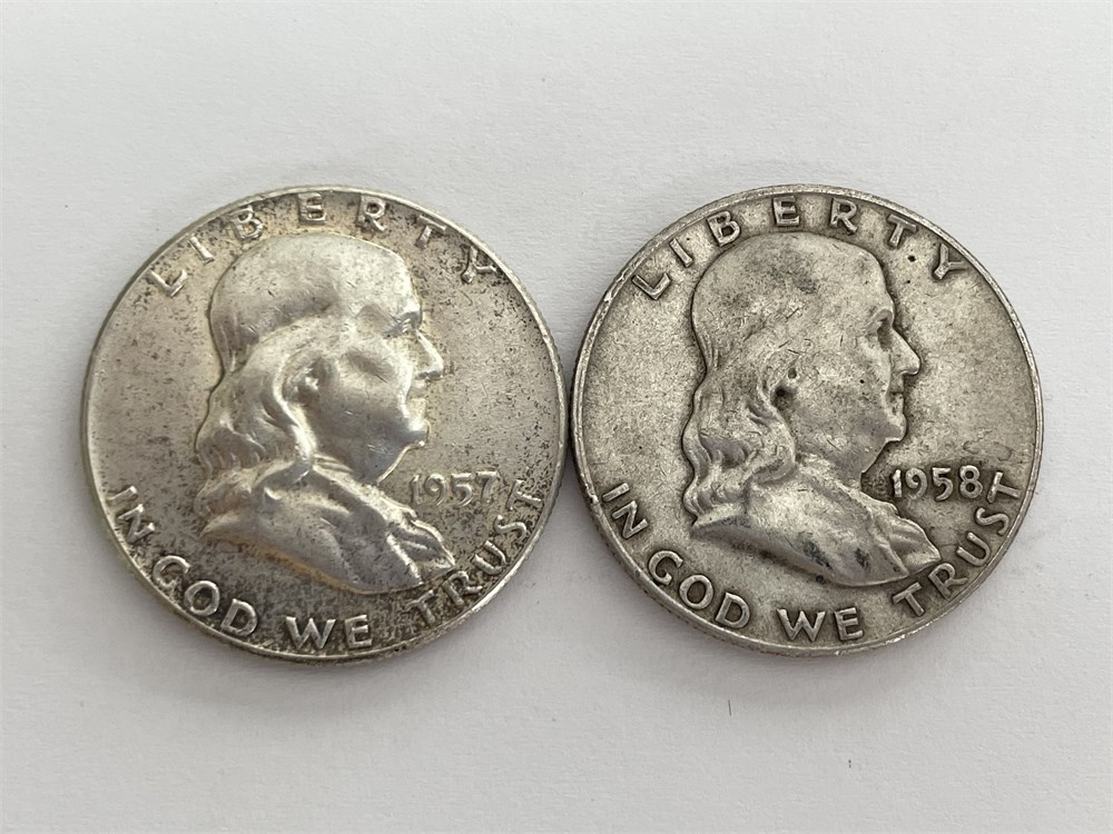 2 Franklin Silver Half Dollars: 1957 P and 1958 D
