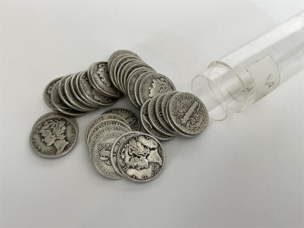 34 Mercury Silver Dimes, in an estate tube labeled with dates in the early 1940's.
