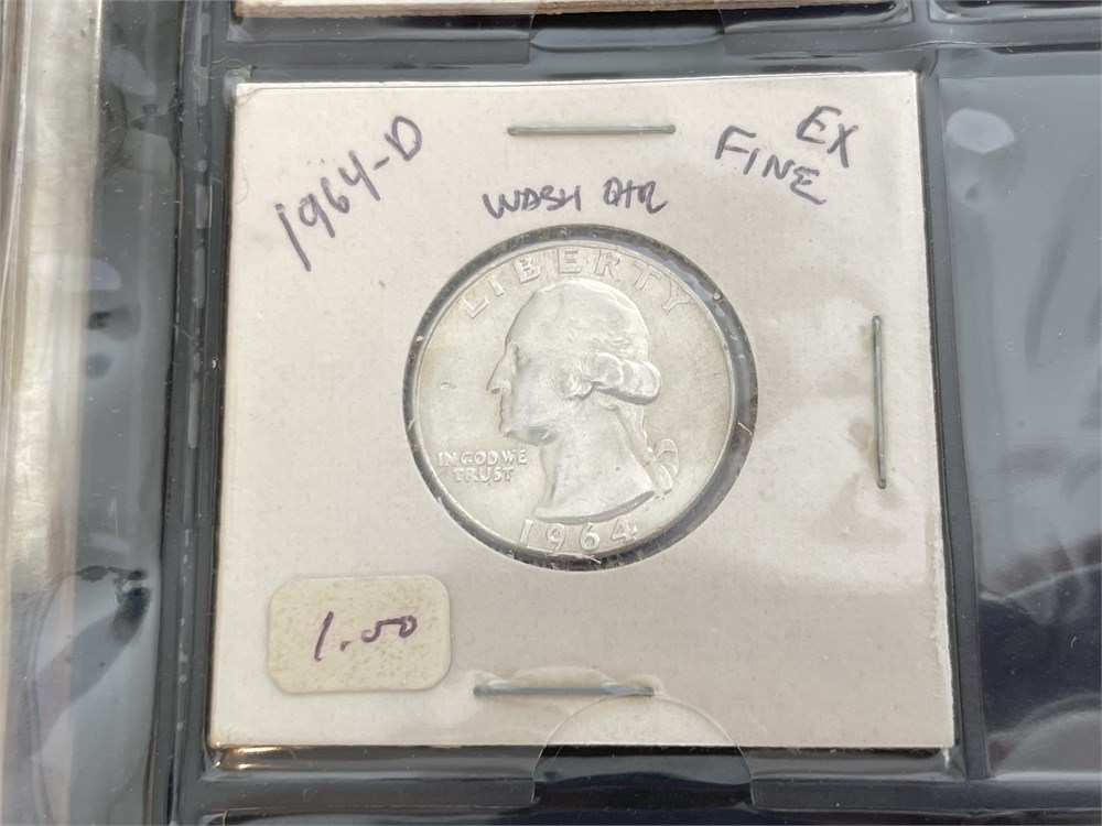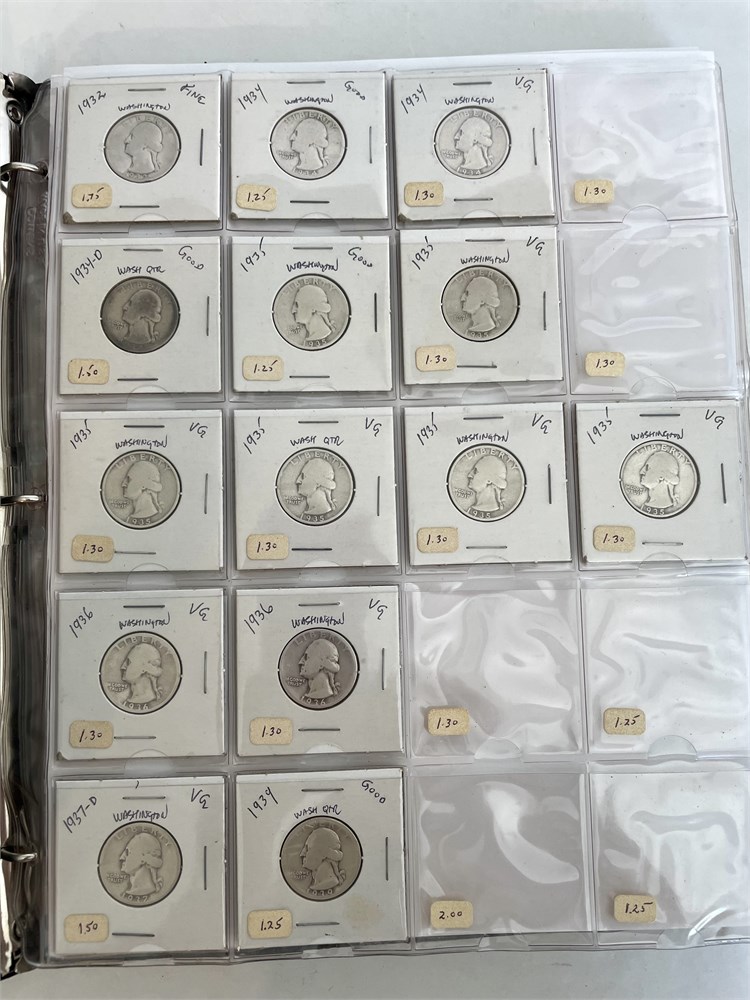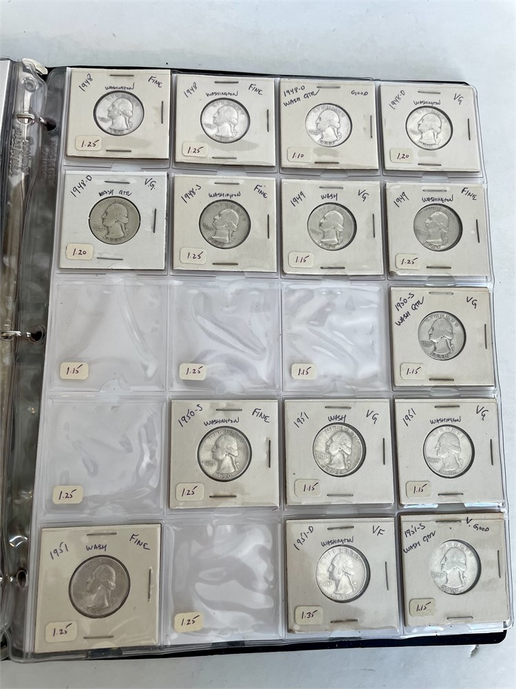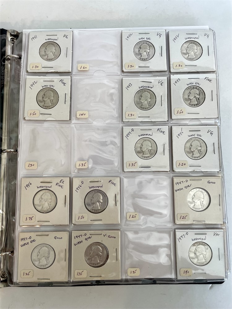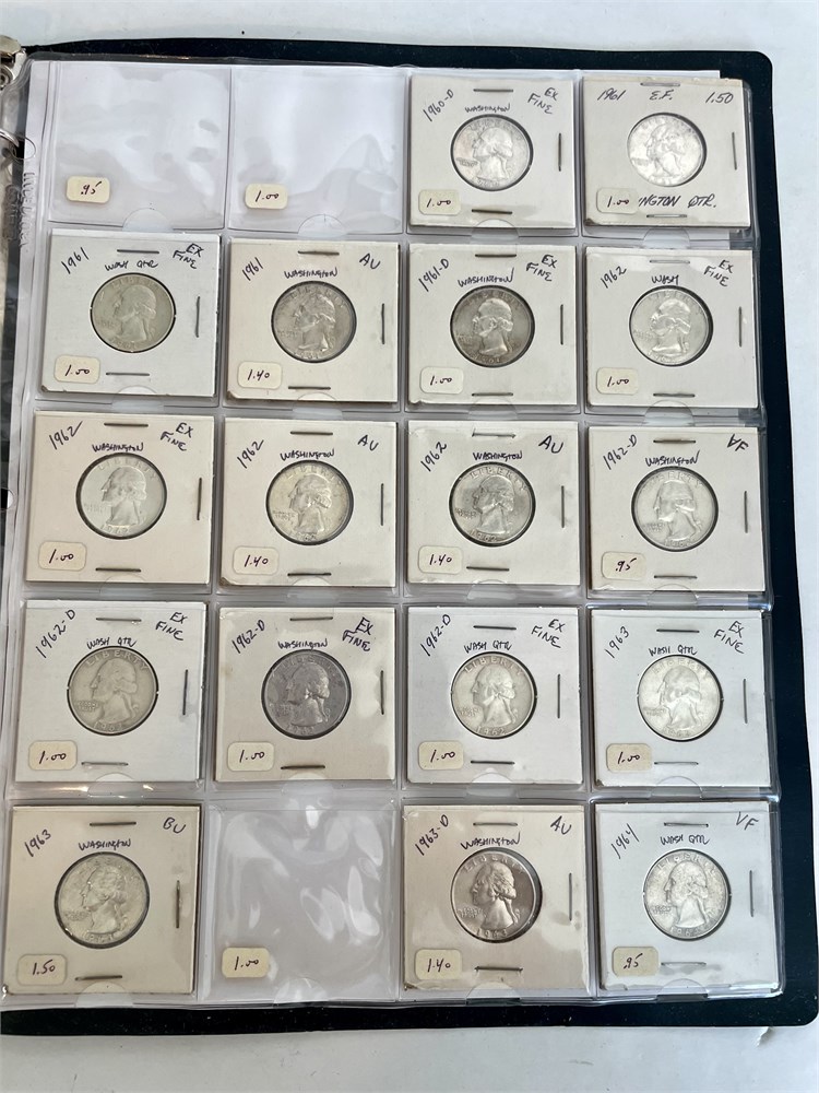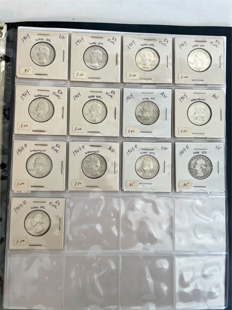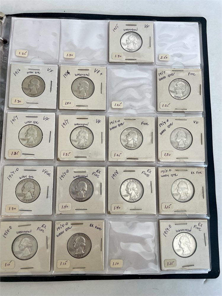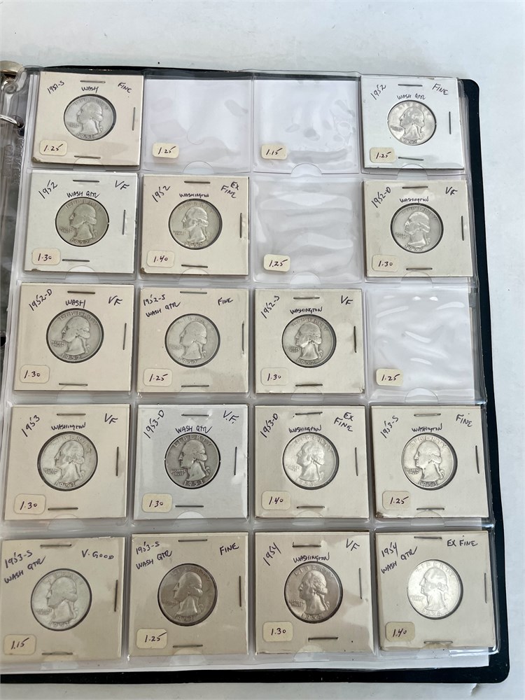 Collection of 104 Washington Silver Quarters.  An estate group of organized and carded quarters, arranged by date.  7 mostly-full sheets in a binder.  All are silver, with dates ranging from 1932 to 1964.