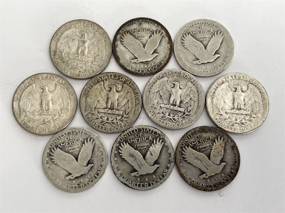 10 U.S. Silver Quarters, assorted dates and conditions as shown in photos.