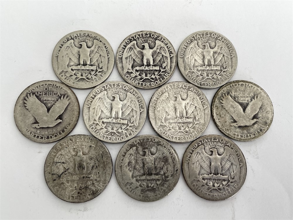 10 U.S. Silver Quarters, assorted dates and conditions as shown in photos.