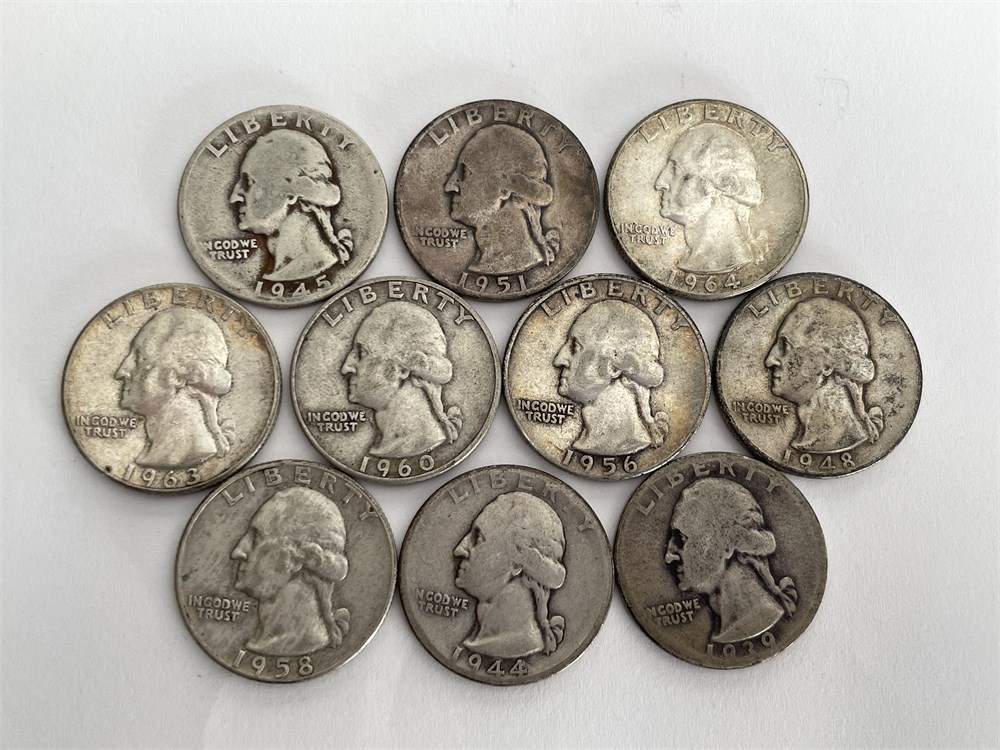10 U.S. Silver Quarters, assorted dates and conditions as shown in photos.