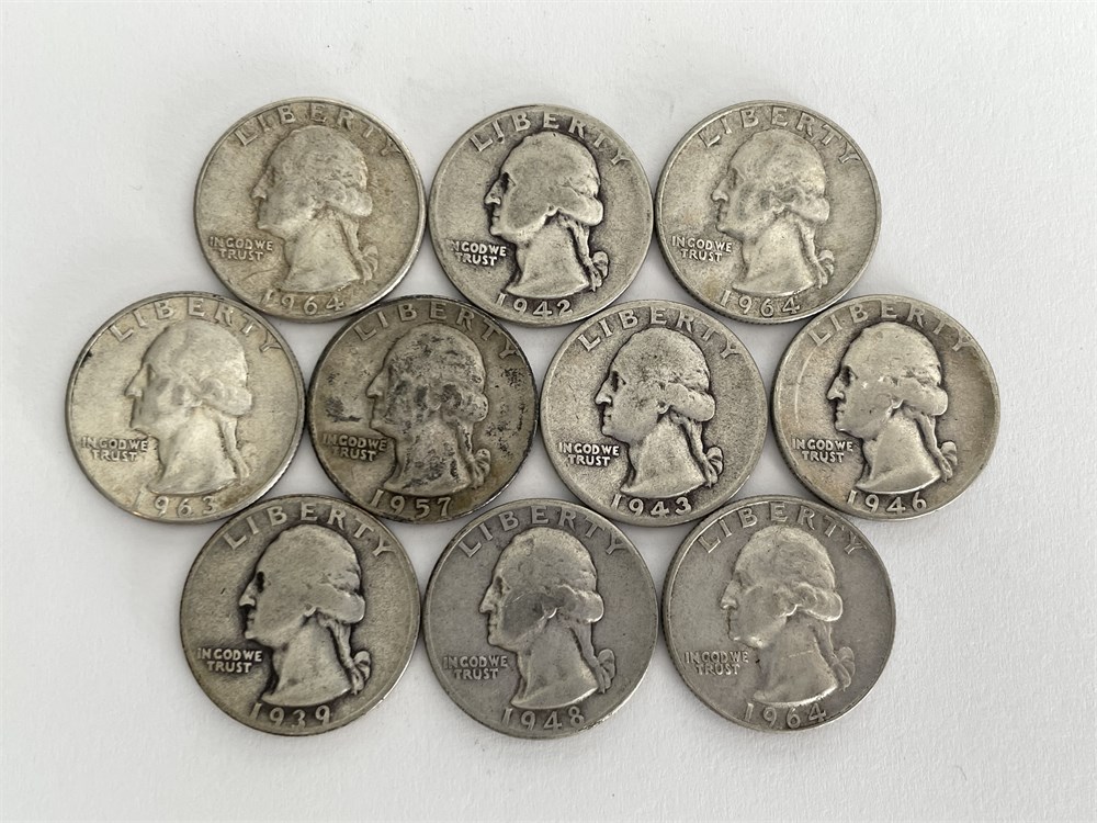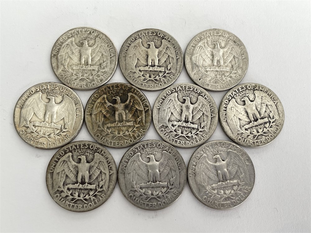 10 U.S. Silver Quarters, assorted dates and conditions as shown in photos.