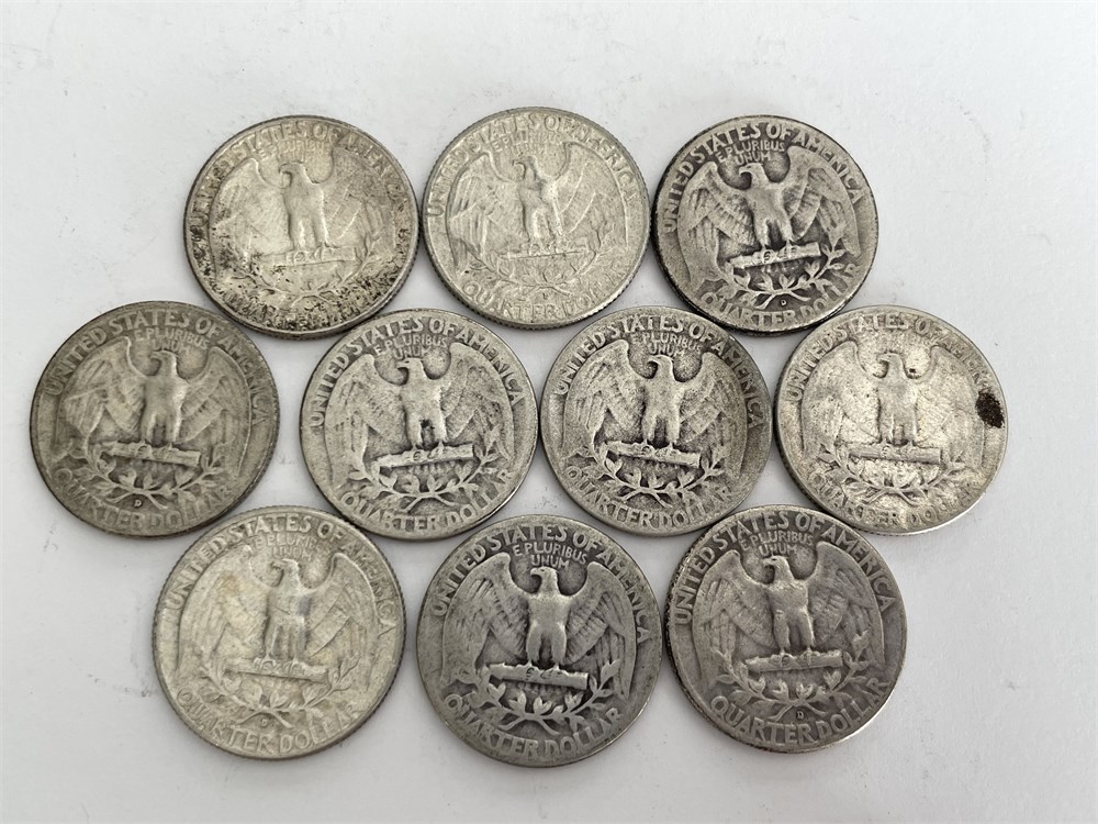 10 U.S. Silver Quarters, assorted dates and conditions as shown in photos.