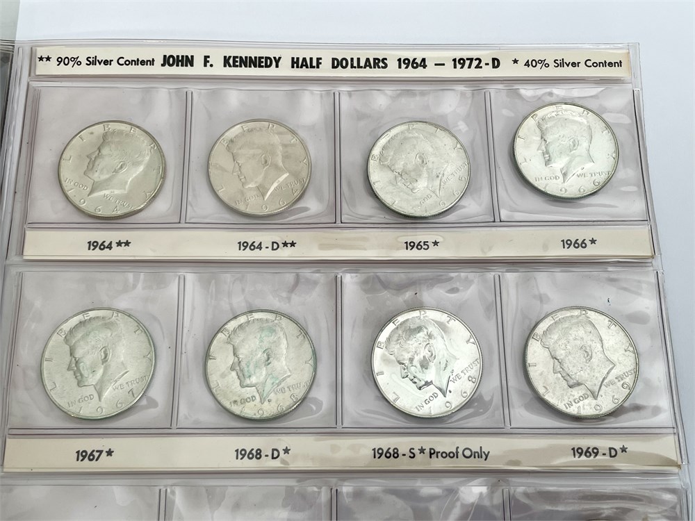 Collector binder with two pages.  Arranged by year and specifics, with stars to indicate those that are 90% silver (**) and 40% silver (*).