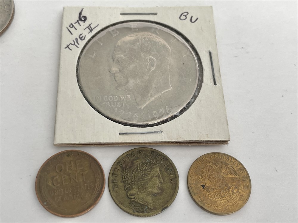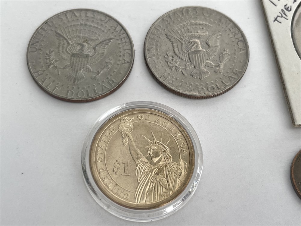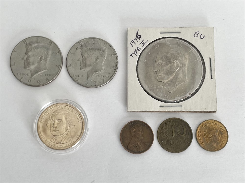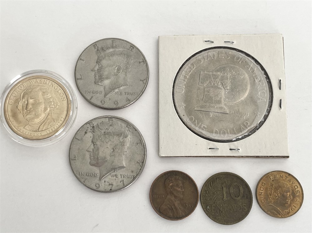 Small group for a beginning collector.  1976 Eisenhower dollar; Washington golden dollar; 2 Kennedy half dollars; more.