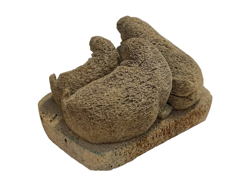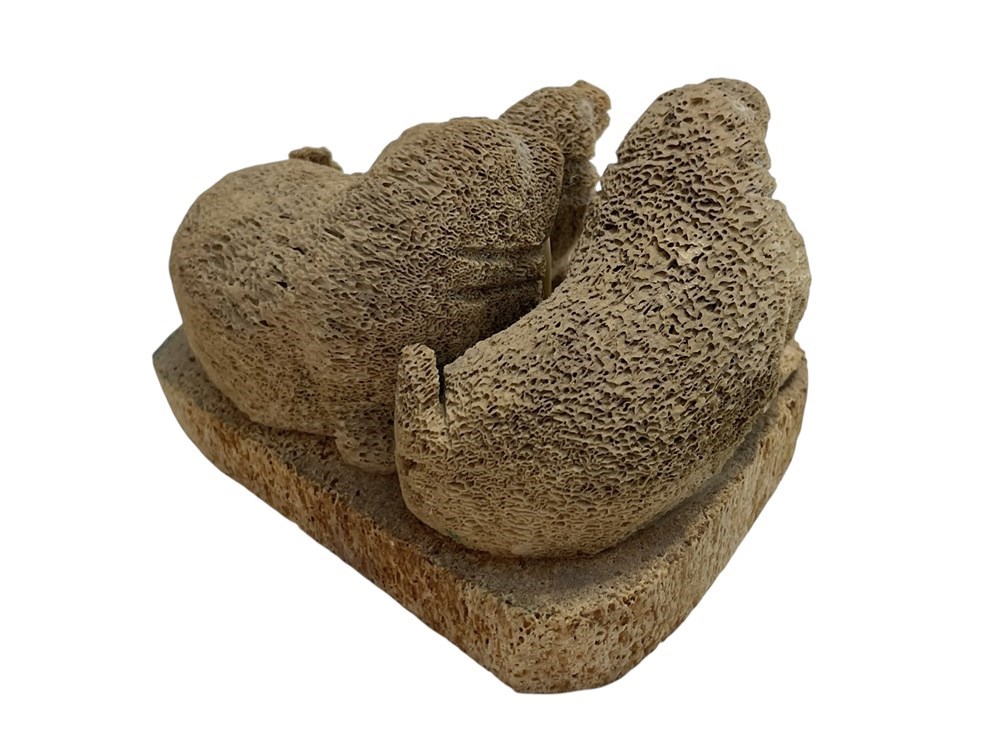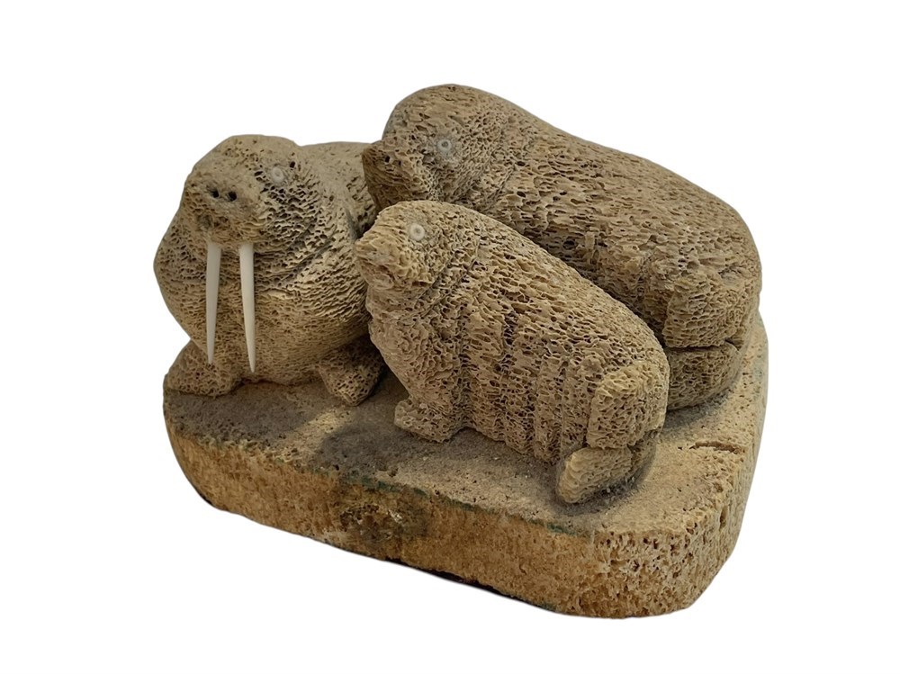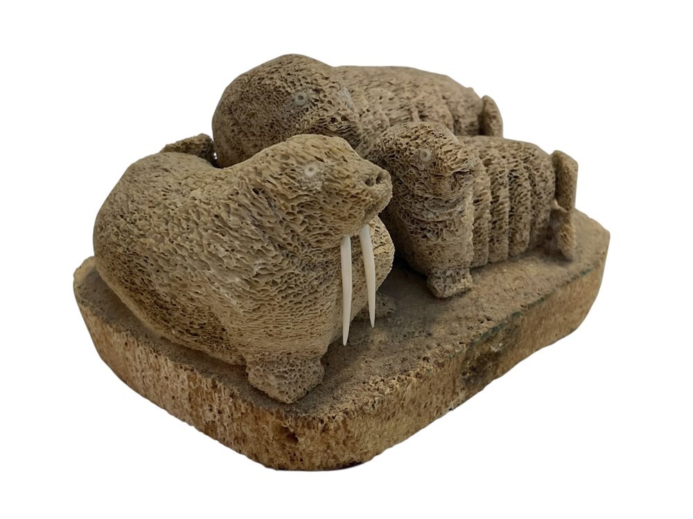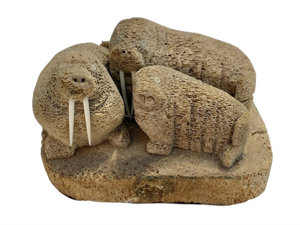 Fossilized whalebone carving of three walruses, the two adults with tusks.