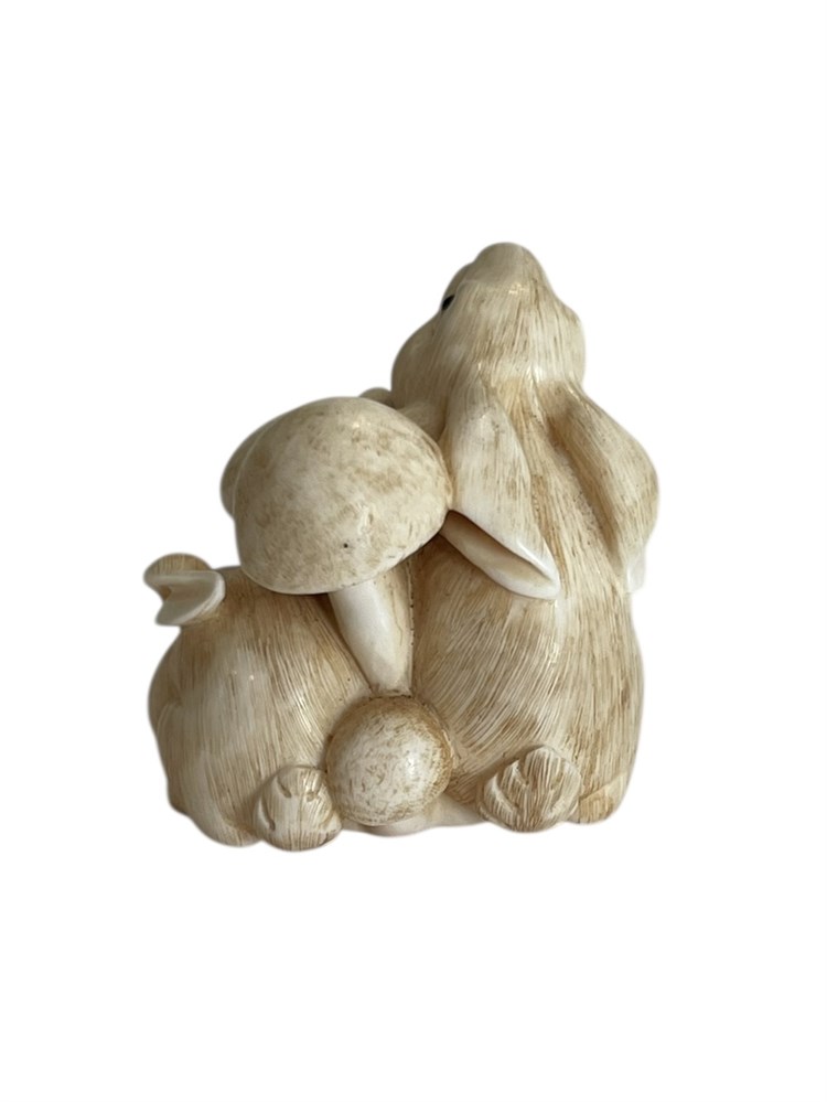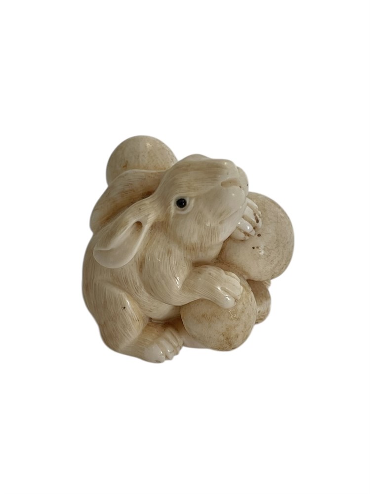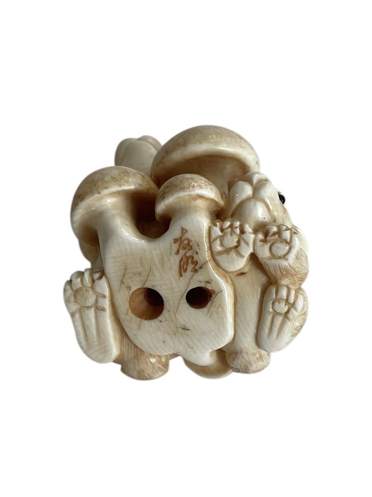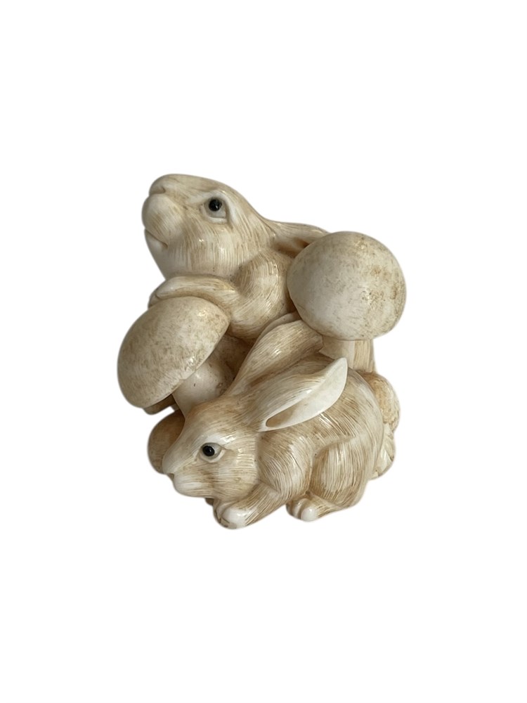 Signed Netsuke of Rabbits and Toadstools, fine detail, 1 1/2" tall.