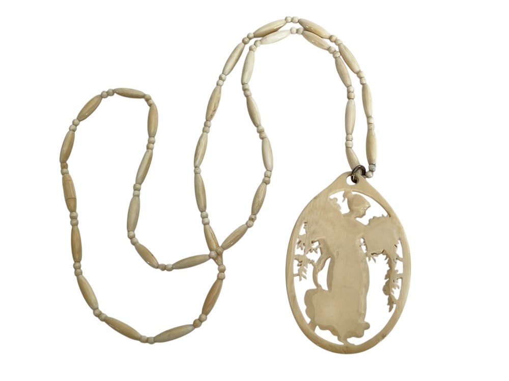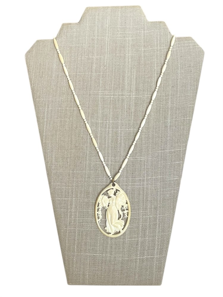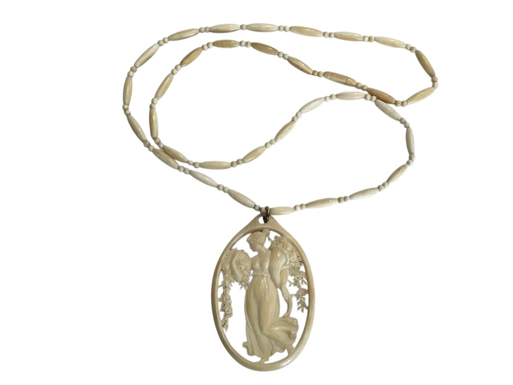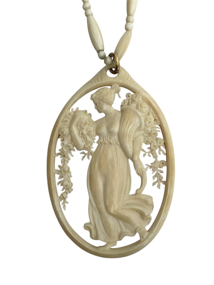 Carved Cameo-Style Pendant Necklace, a beautifully detailed image of a classical woman strolling through cascading flowers.