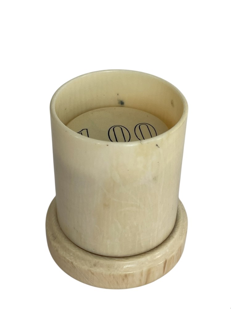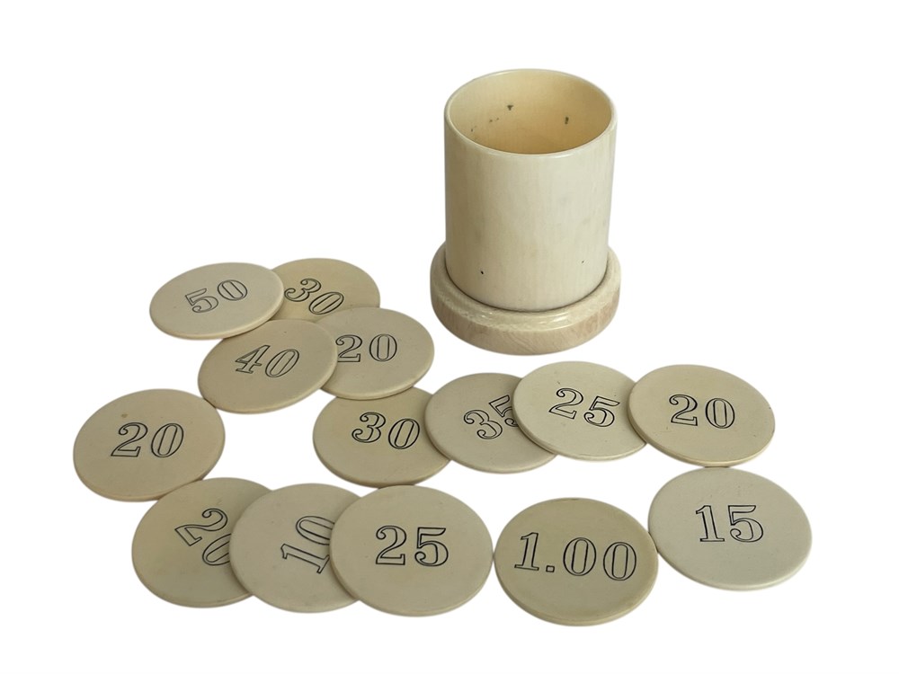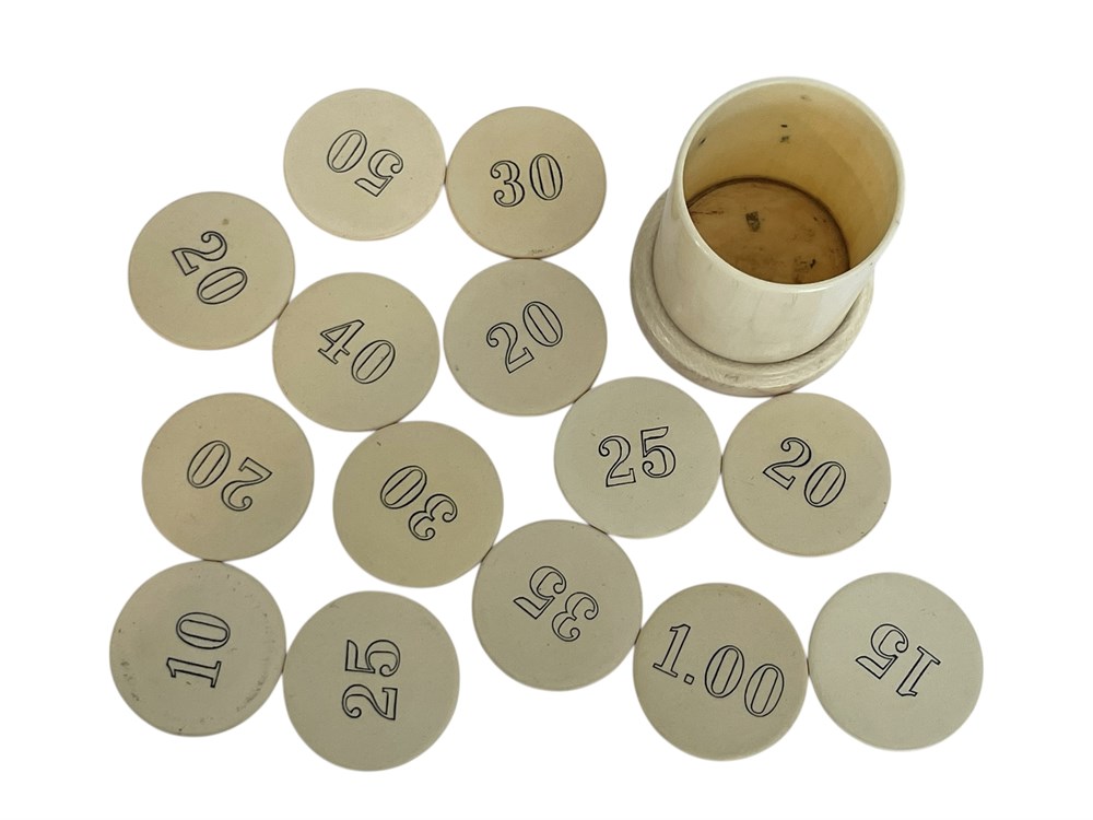 Round tokens in various denominations up to $1.00, for gaming/gambling.  In a cylinder that is 3" tall.