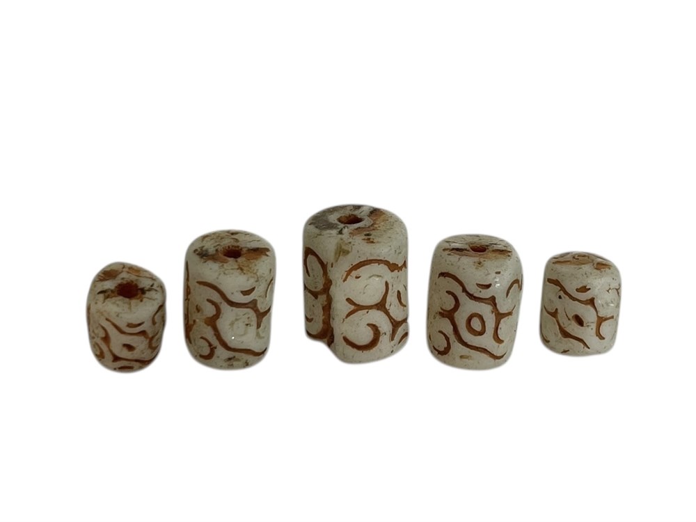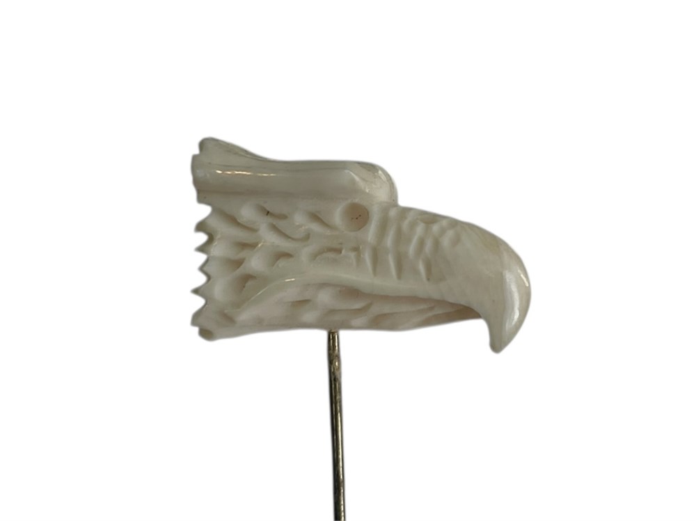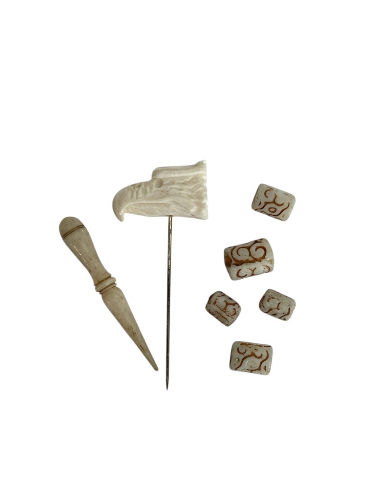 5 small beads in graduated sizes; a stickpin with carved eagle's head; and a small bone sewing awl (1 3/4").