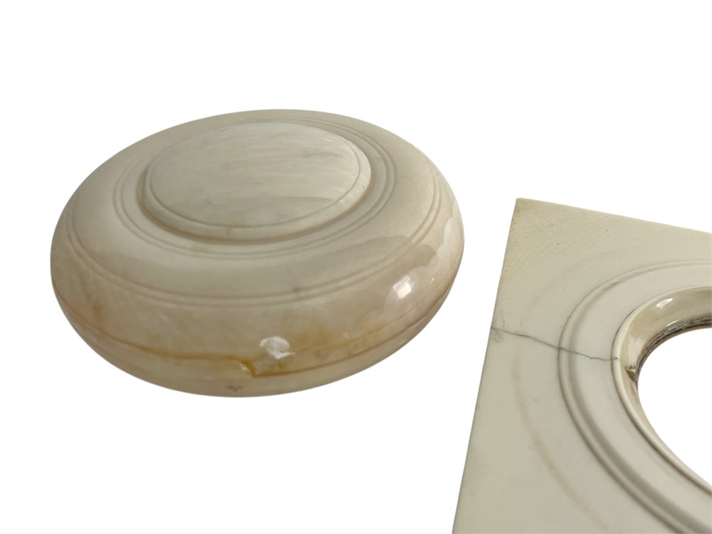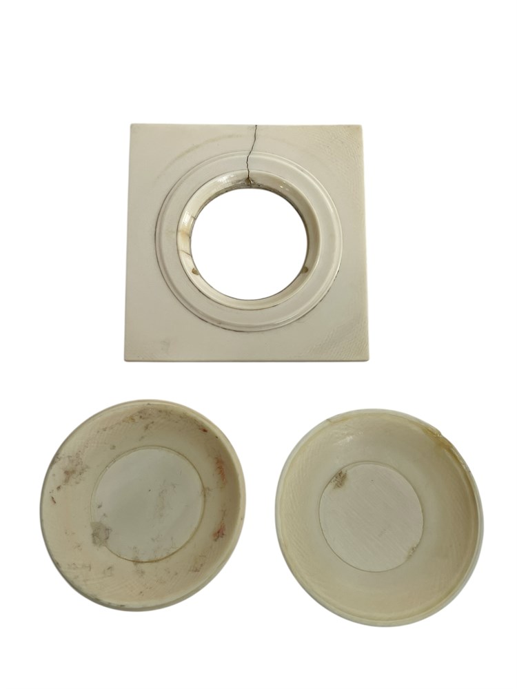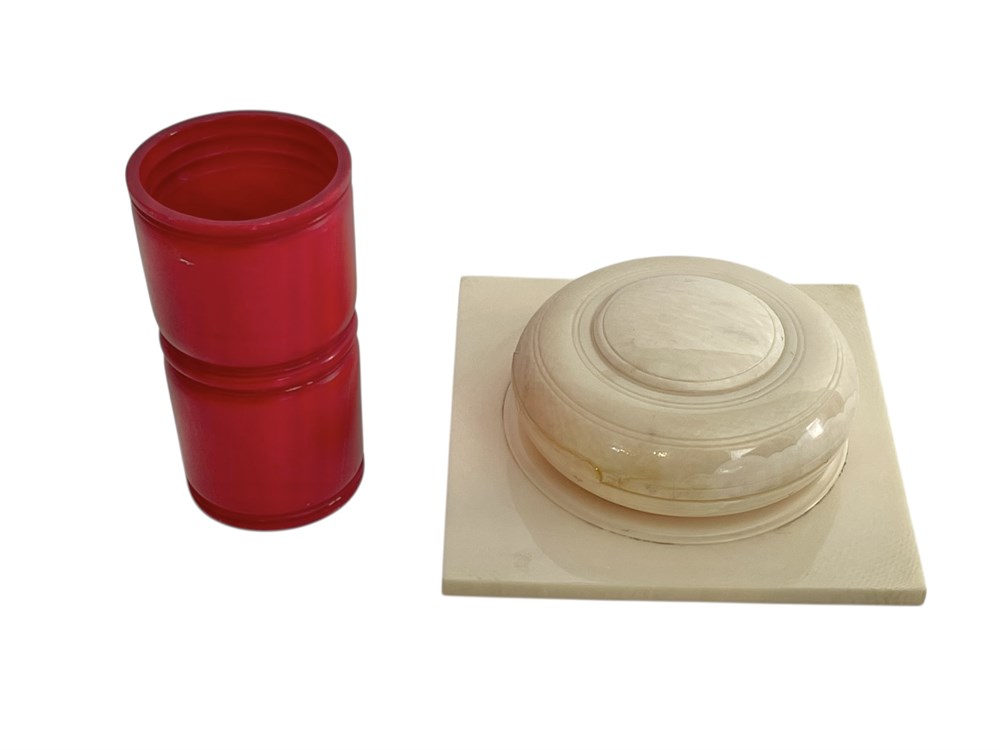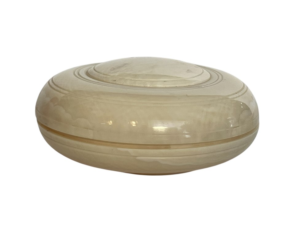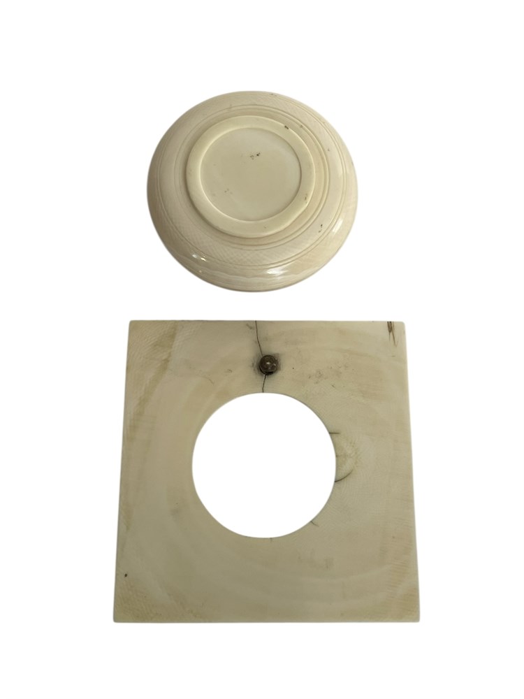 Screw-top pillbox, about 2" diameter, with damage/glue on one side of the lid.  It rests on a "base" that may or may not actually go with it.