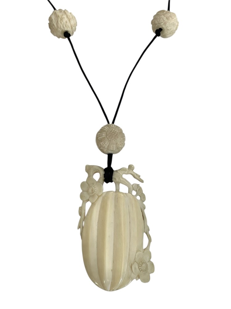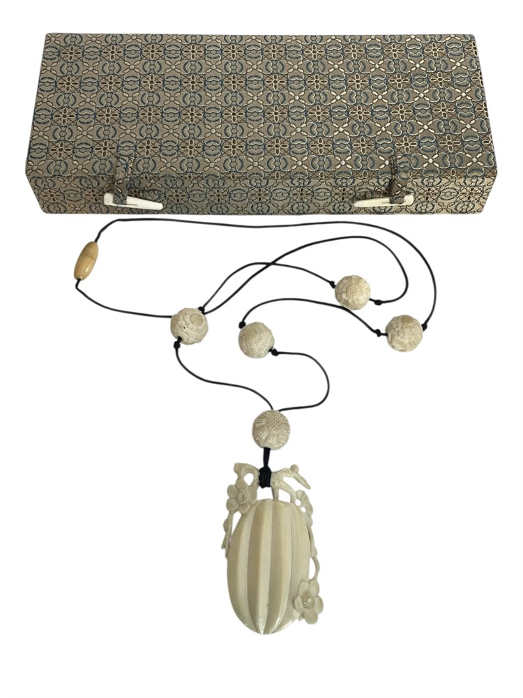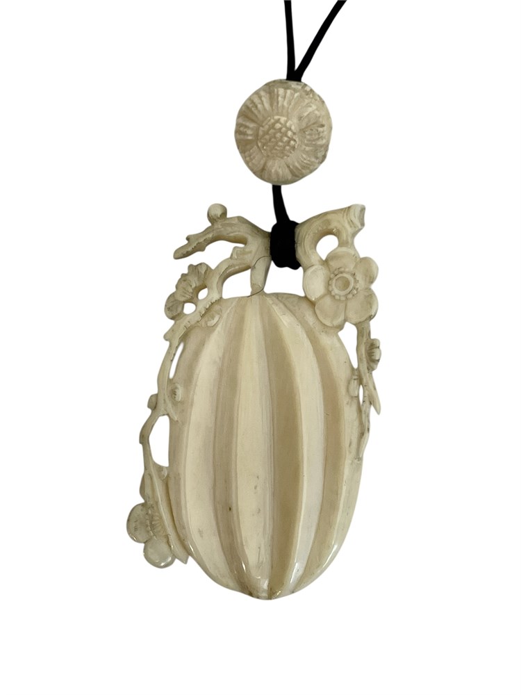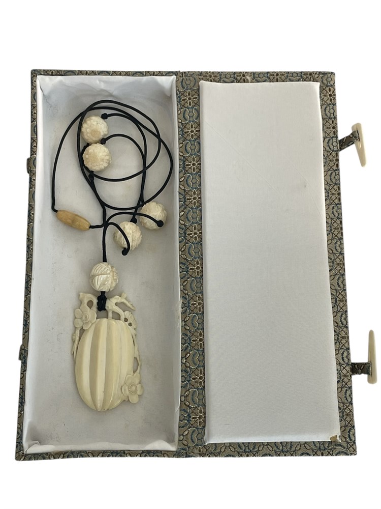 A pumpkin or gourd with vines and blooms, carved as a pendant, along with five round floral accent beads on the cord.  Includes Asian style box.